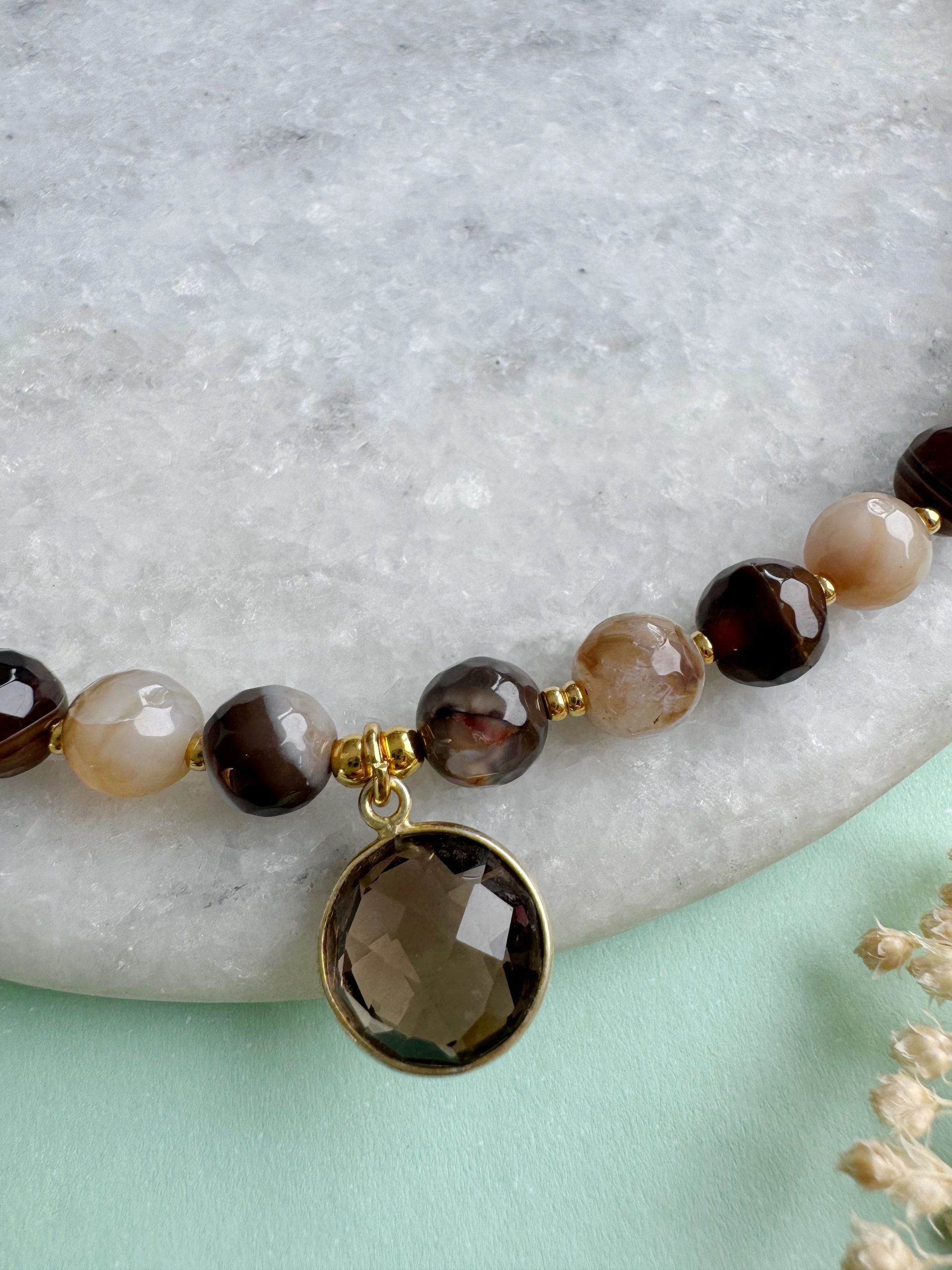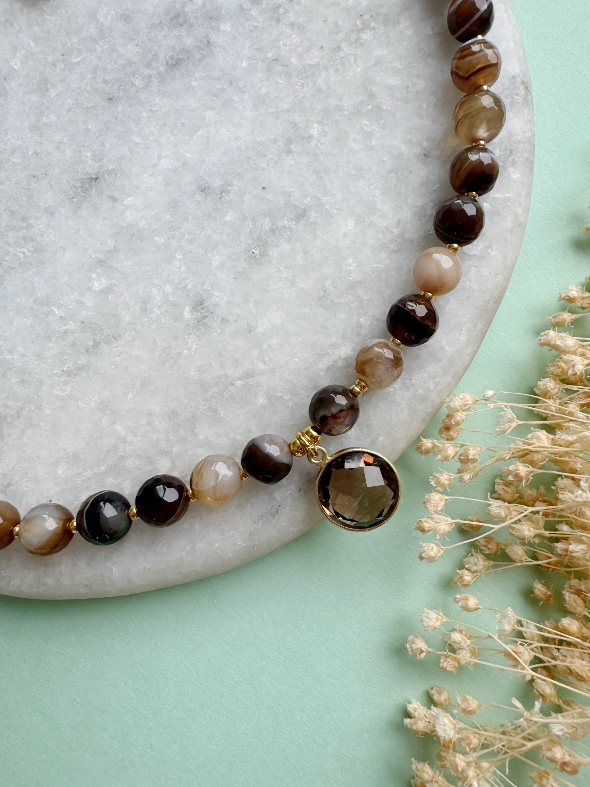 Vanilla-Choco-Latte: Diese Statement Kette braucht keine Konkurrenz. Auffällig Achat-Perlen treffen auf goldige Details und einem passenden Anhänger aus Rauchquarz.