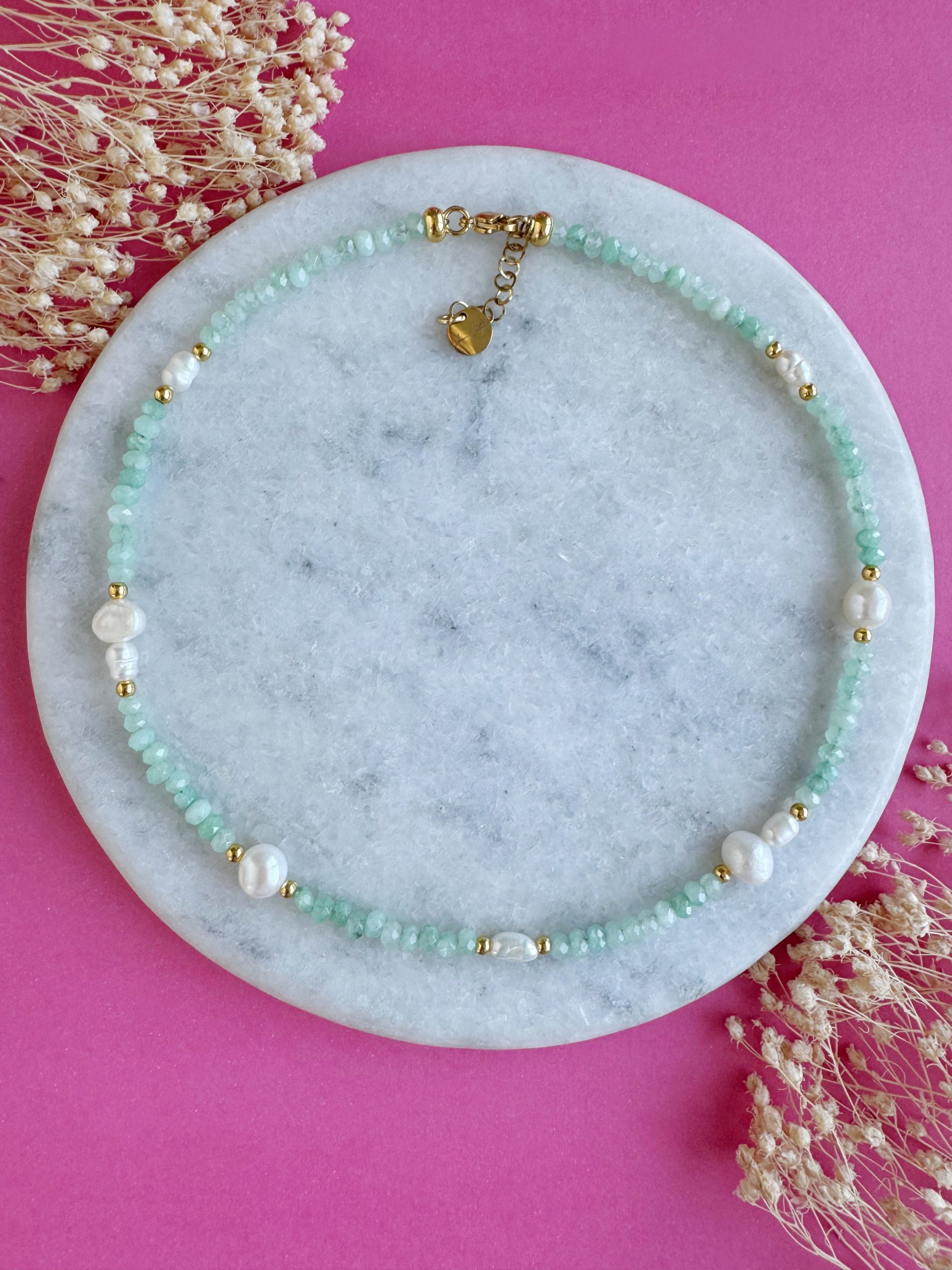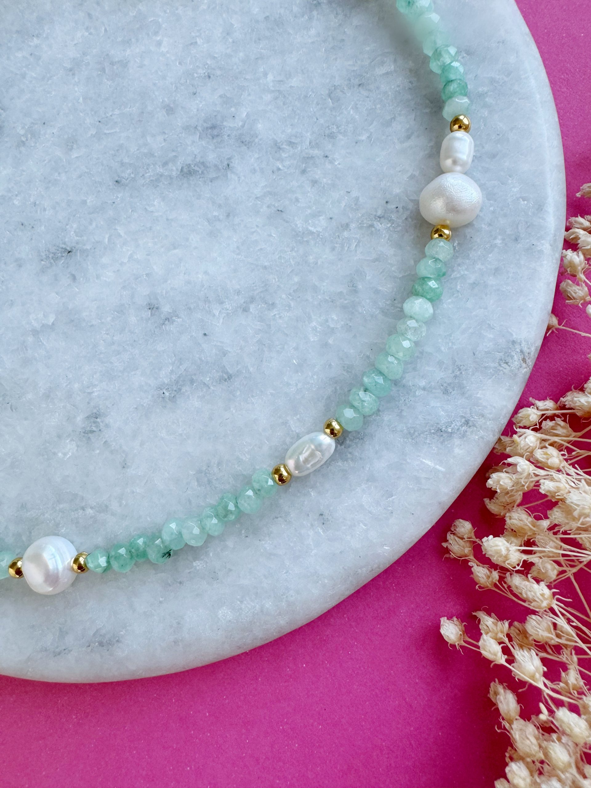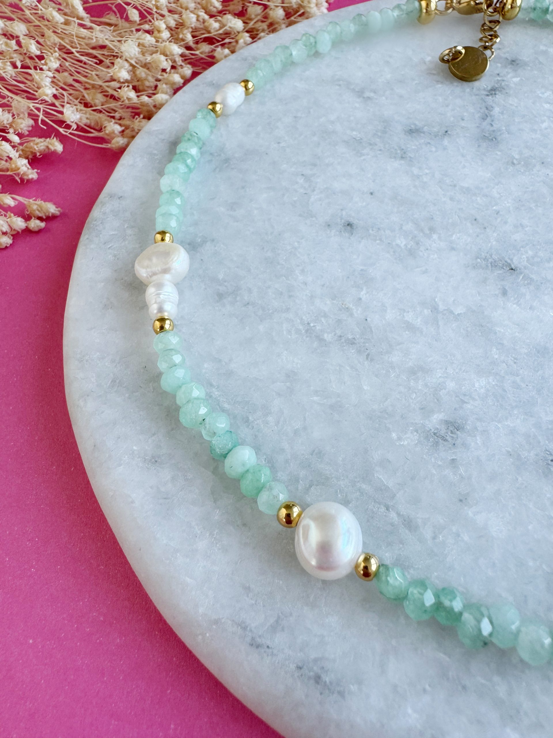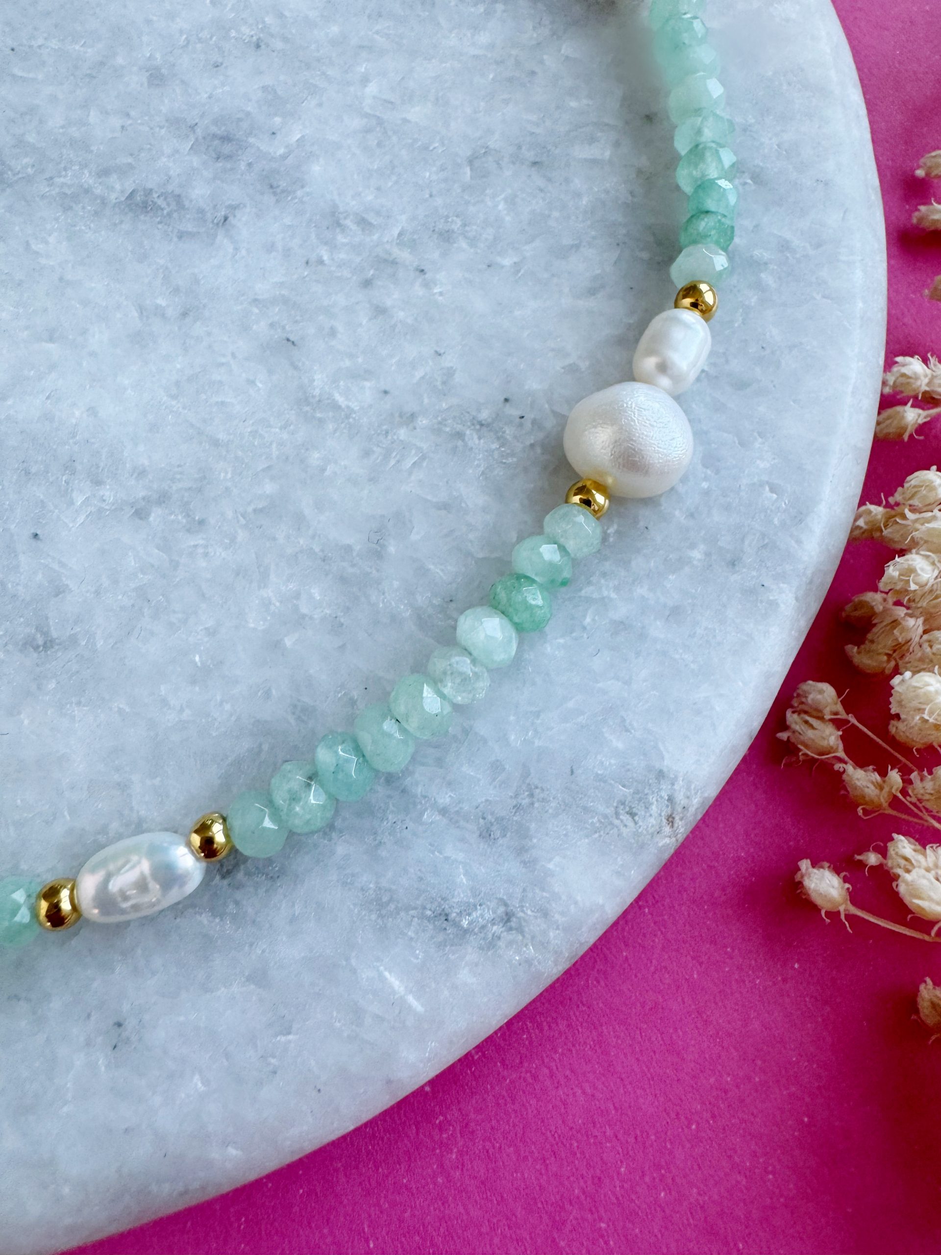 Pastell-Ole! „The Sunny Breeze“: strahlend türkise Achat-Rondelle & weiße Süßwasserperlen werden ergänzt durch kleine goldige MDetails und erzeugen so ein frisches und elegantes Gesamtbild. Dank der Verlängerungskette ist man in der Länge flexibel.
