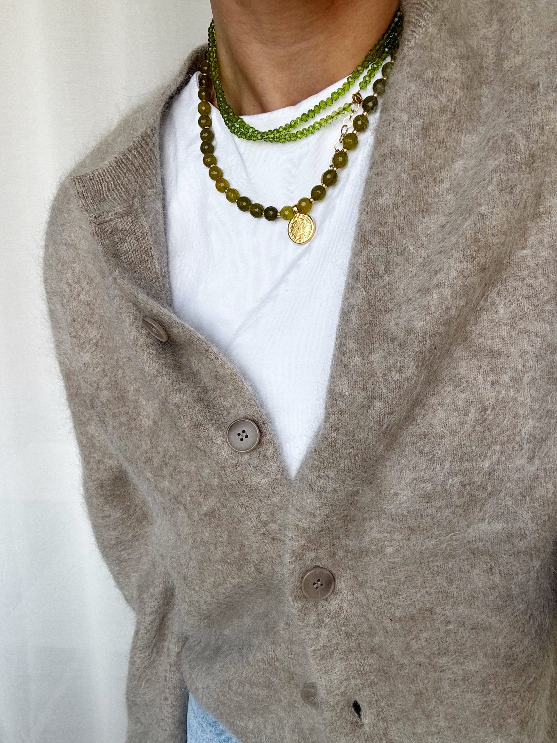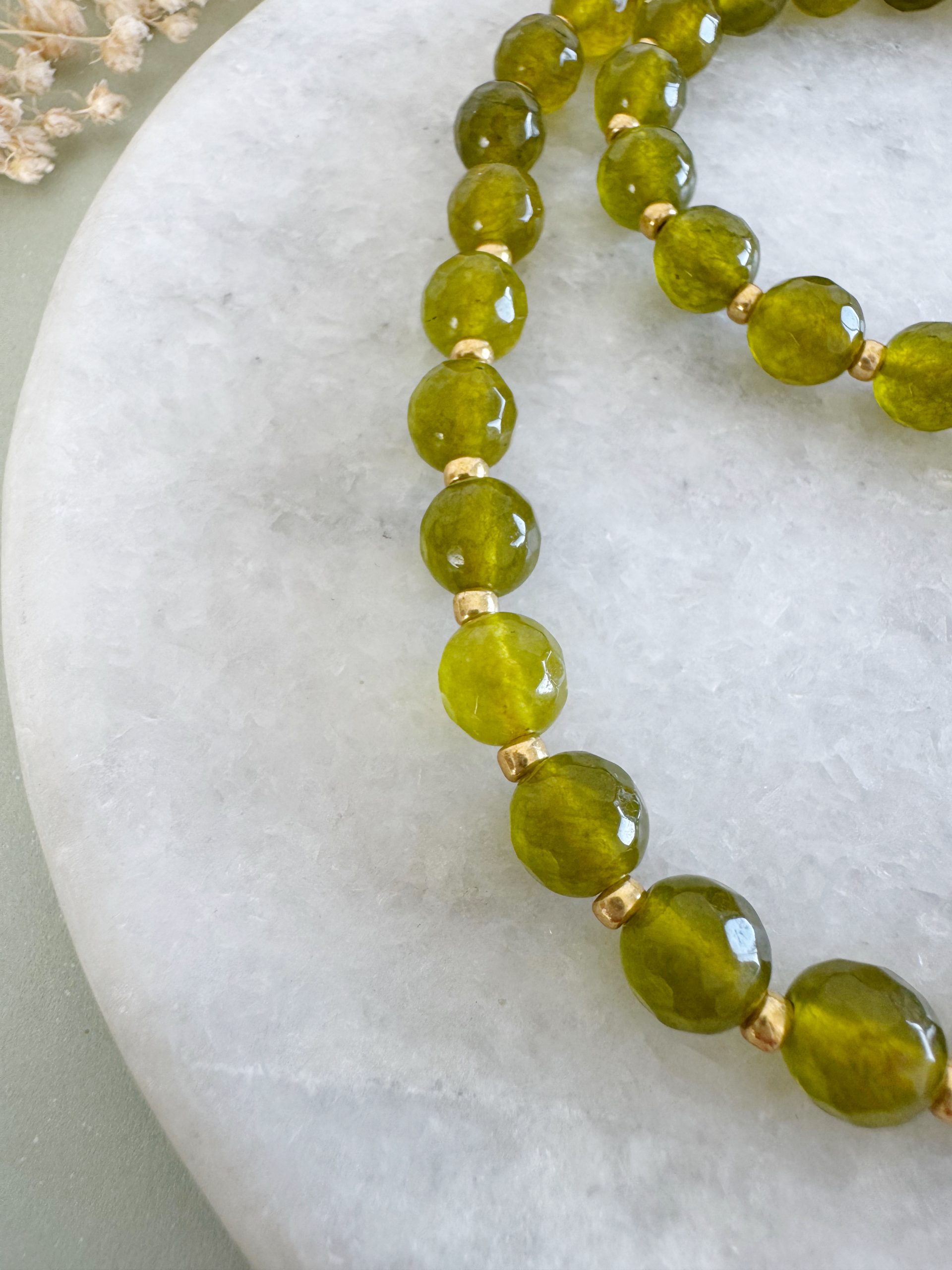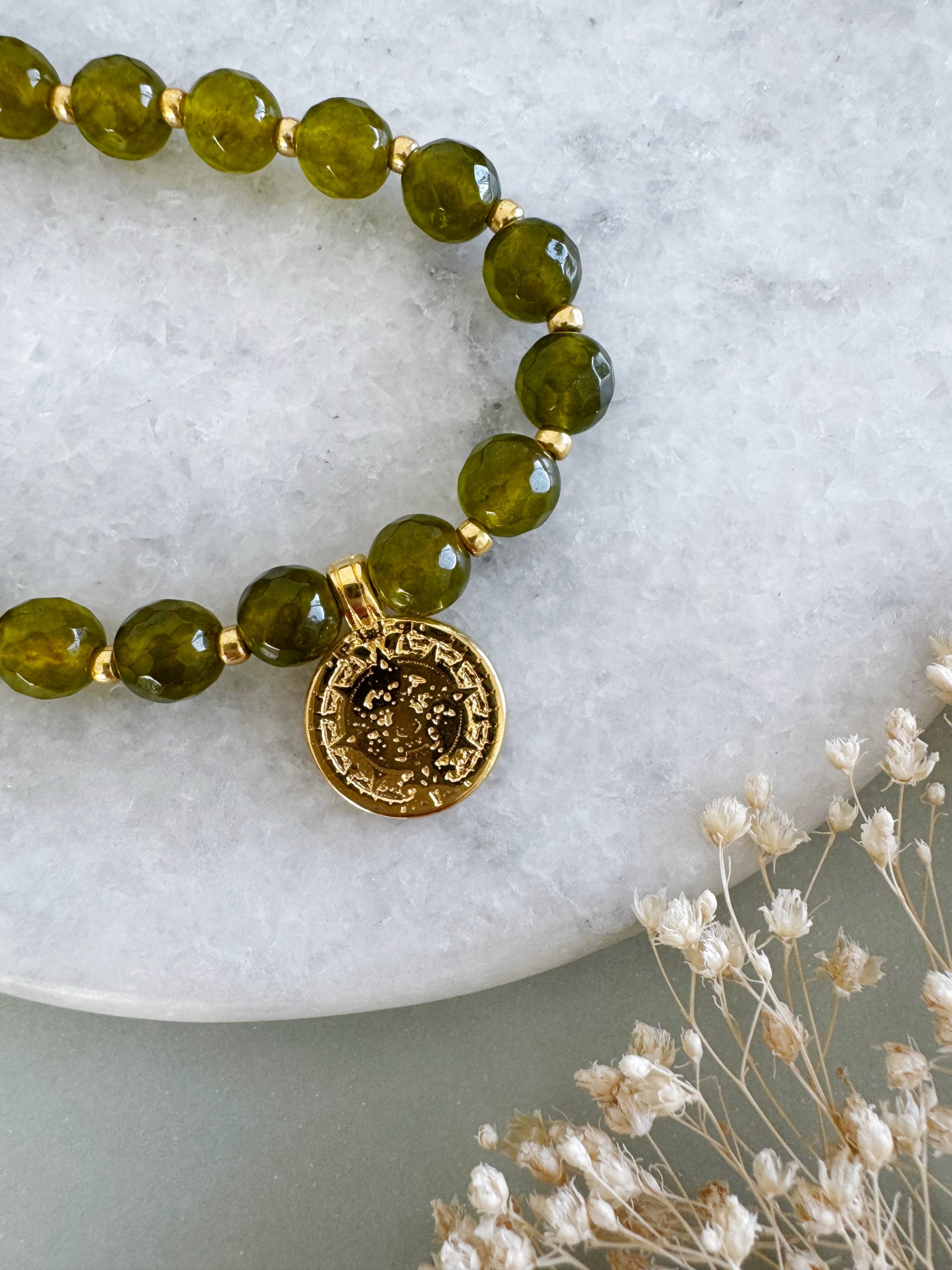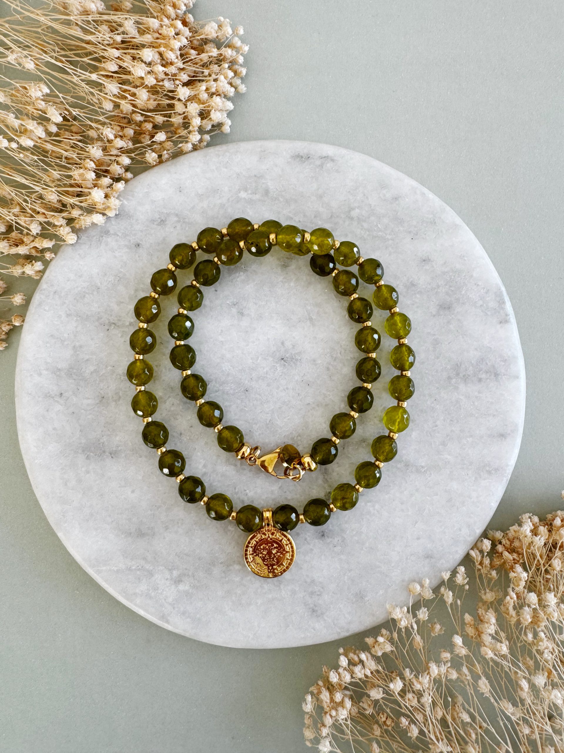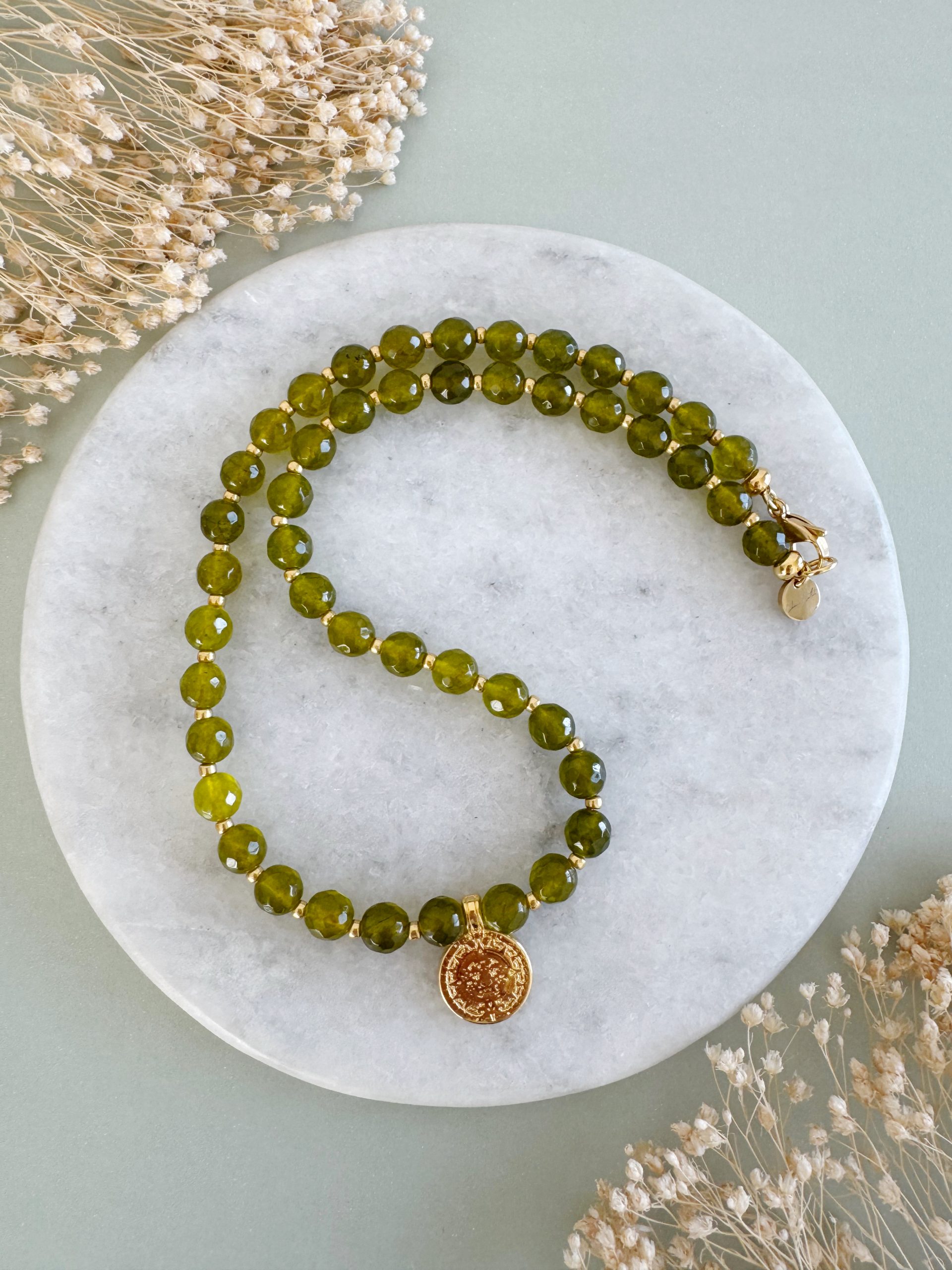 Oliv-Grün trifft auf goldige Details und einen passenden Anhänger. Besonderes Schmuckstück, das keine Konkurrenz benötigt.