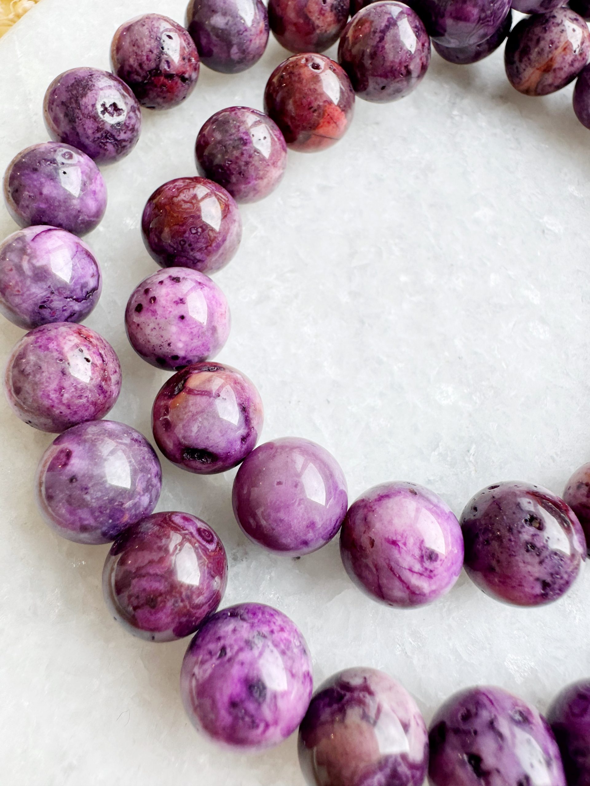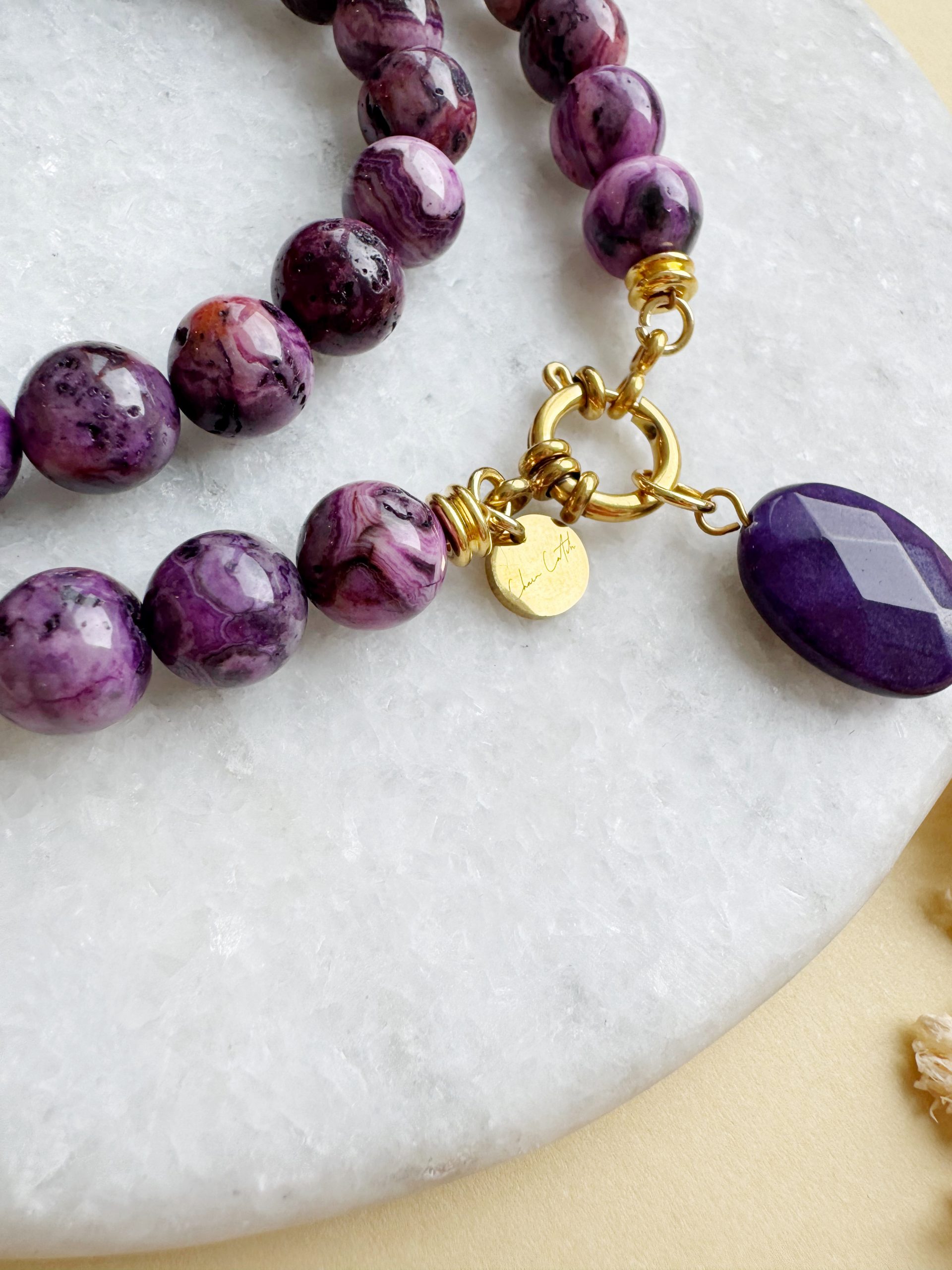 Ein bisschen Lila, ein bisschen Violet. 10mm Jaspis-Perlen mit spätsommerlichen Maserung, goldigen Details und einem ovalen Anhänger aus einem Jade-Stein.