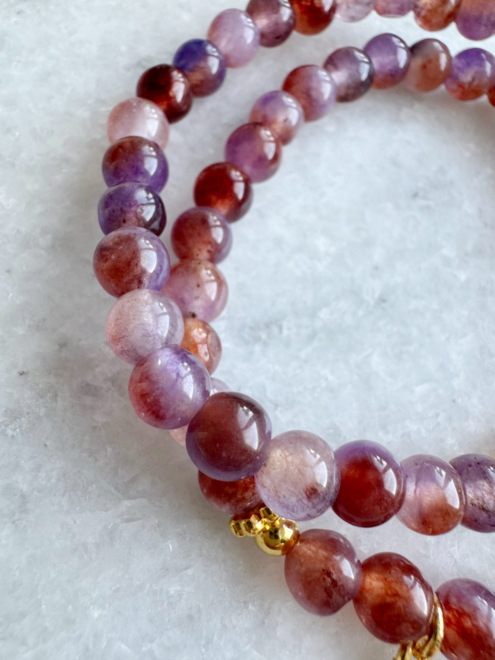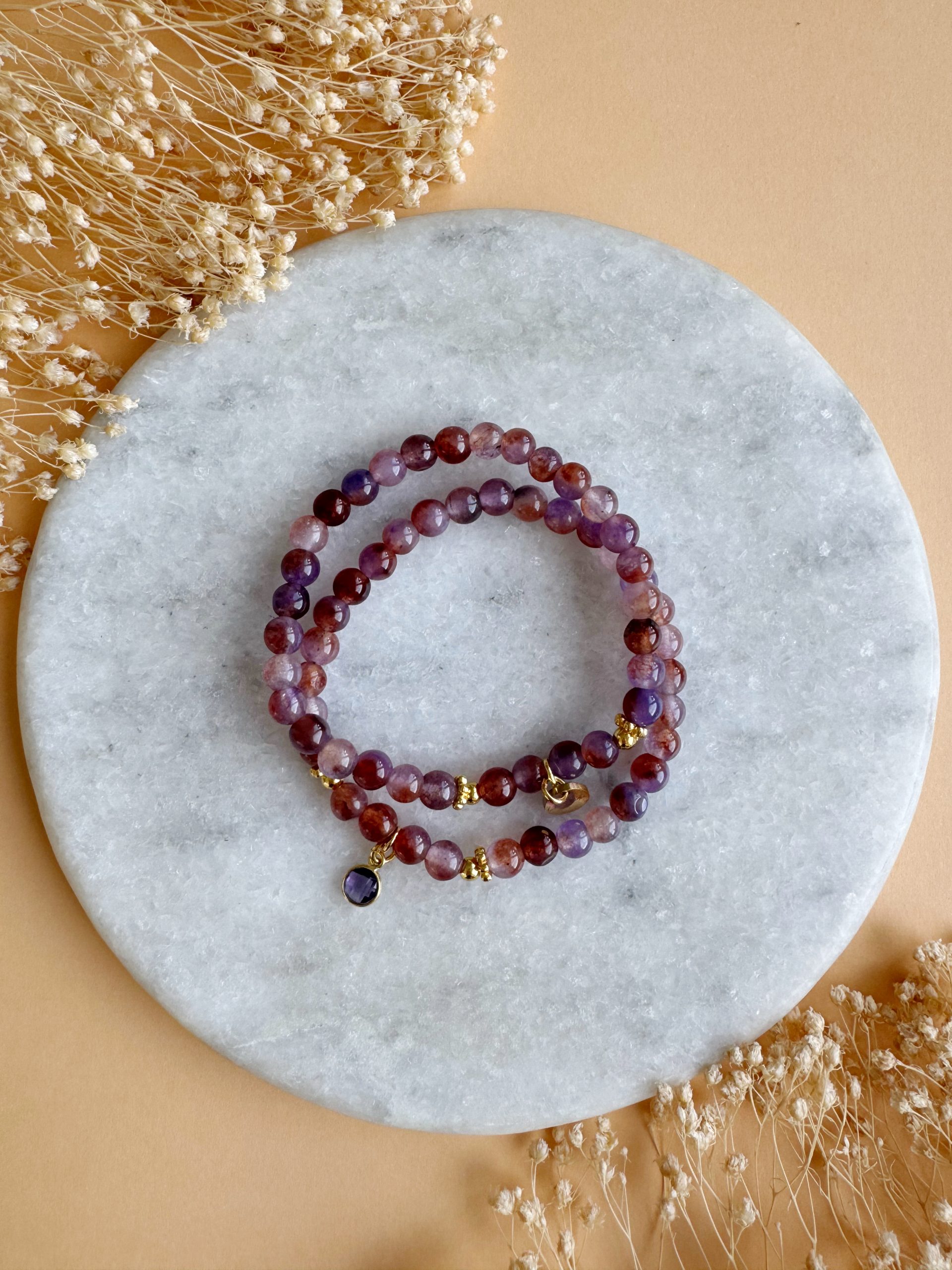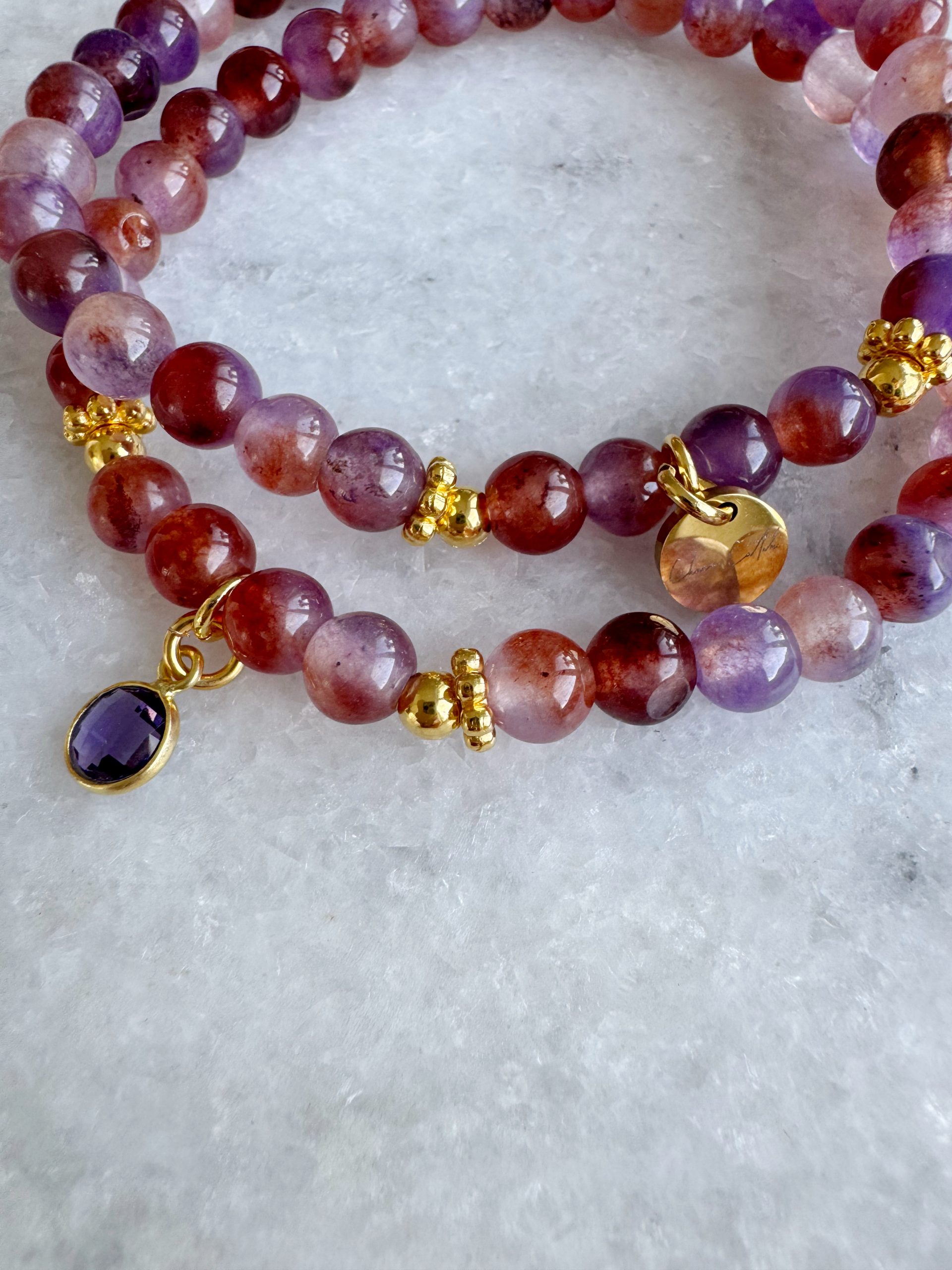Heiß wie ein Glühwein: „Merlot Love“ kommt in Flieder/Bordeaux/Braun. Die 6mm Jade-Perlen sind gepaart mit goldigen Details und einem passenden Anhänger aus Amethyst.