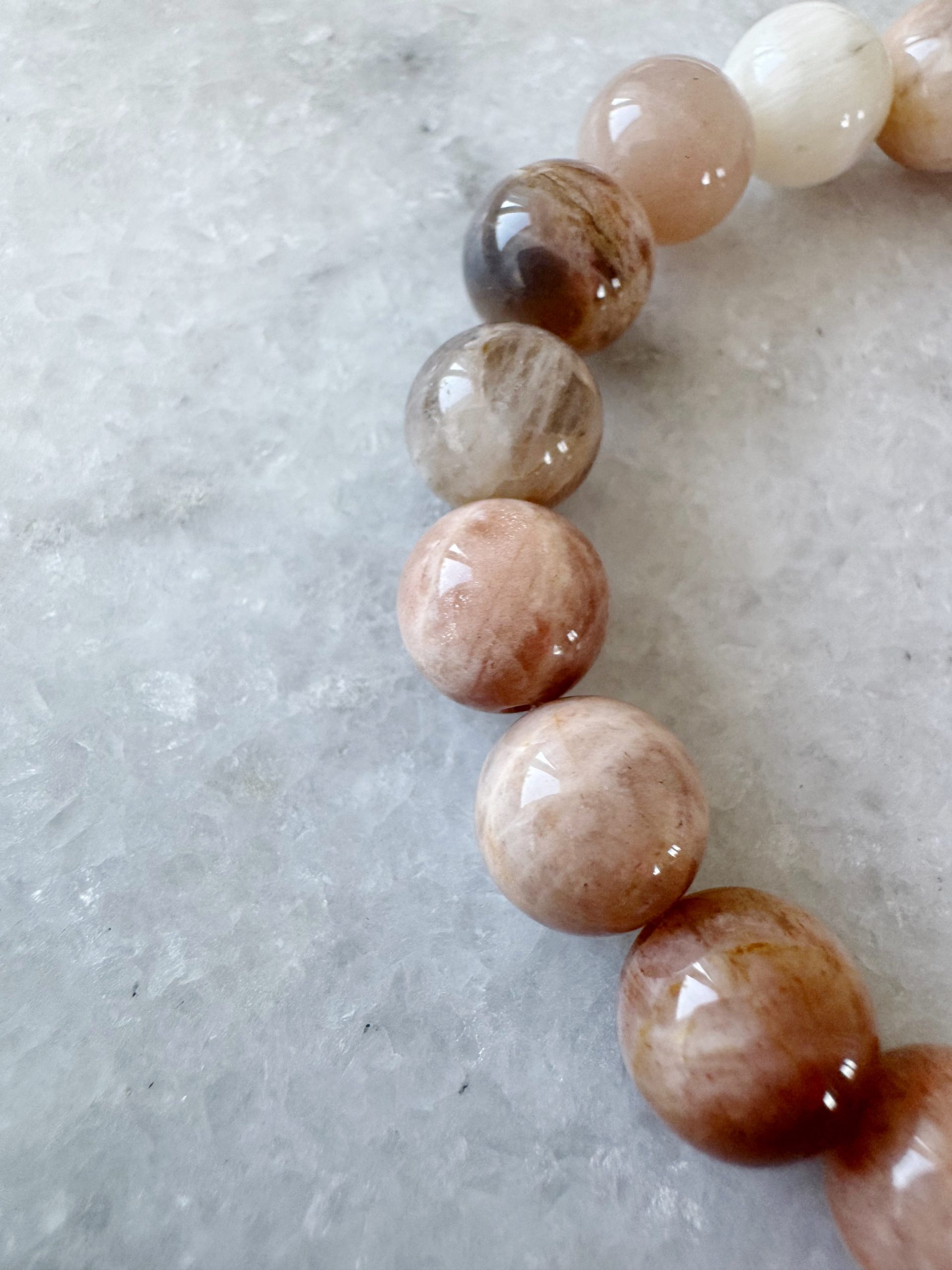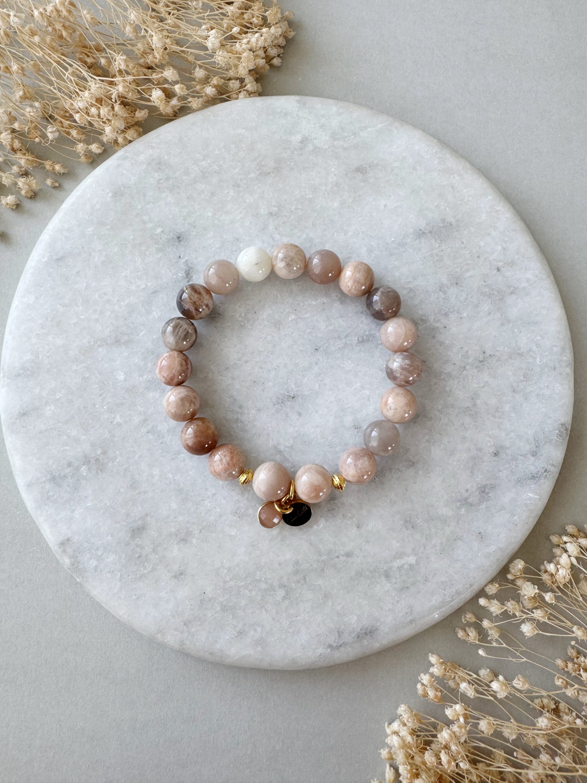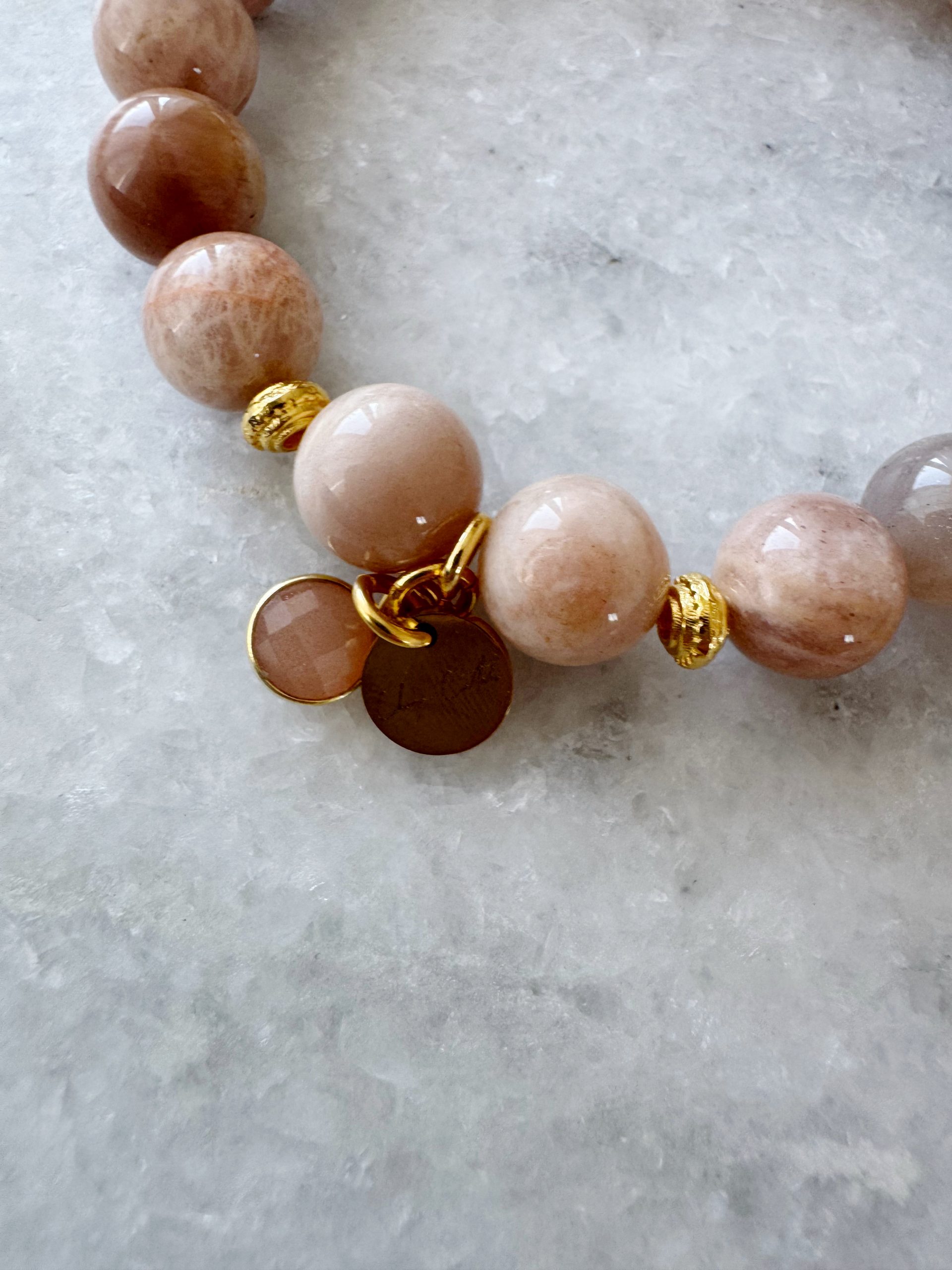 Der Mondstein erstrahlt bei Charm Catch in neuer Größe: 10 mm. Das Armband aus fein gemaserten Mondstein-Perlen besticht durch die pastelligen Farben in Apricot und Rosé. Als Anhänger kommen ein Plättchen und ein Anhänger aus Sonnenstein.