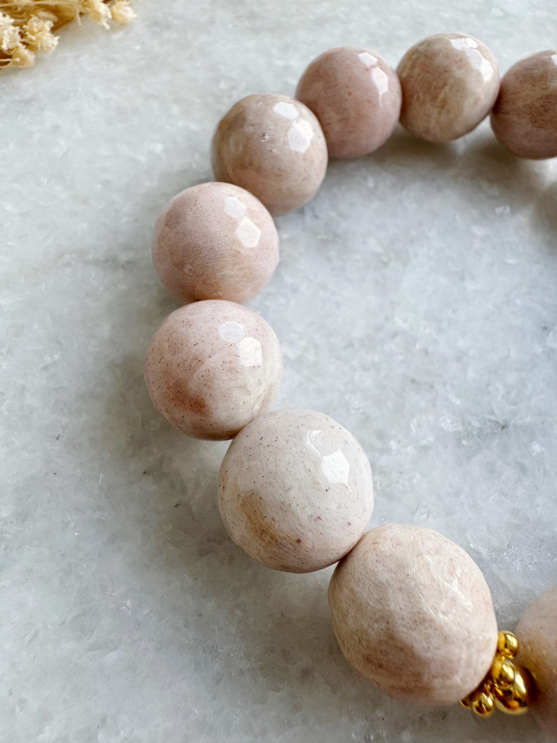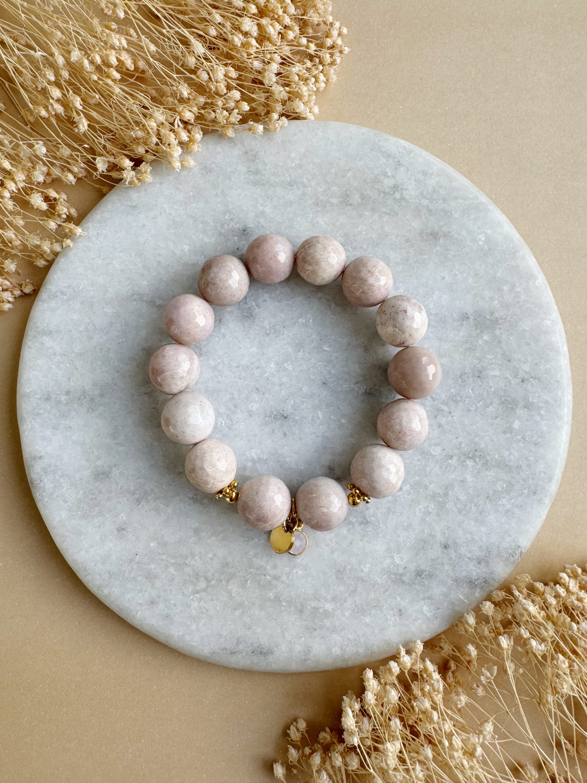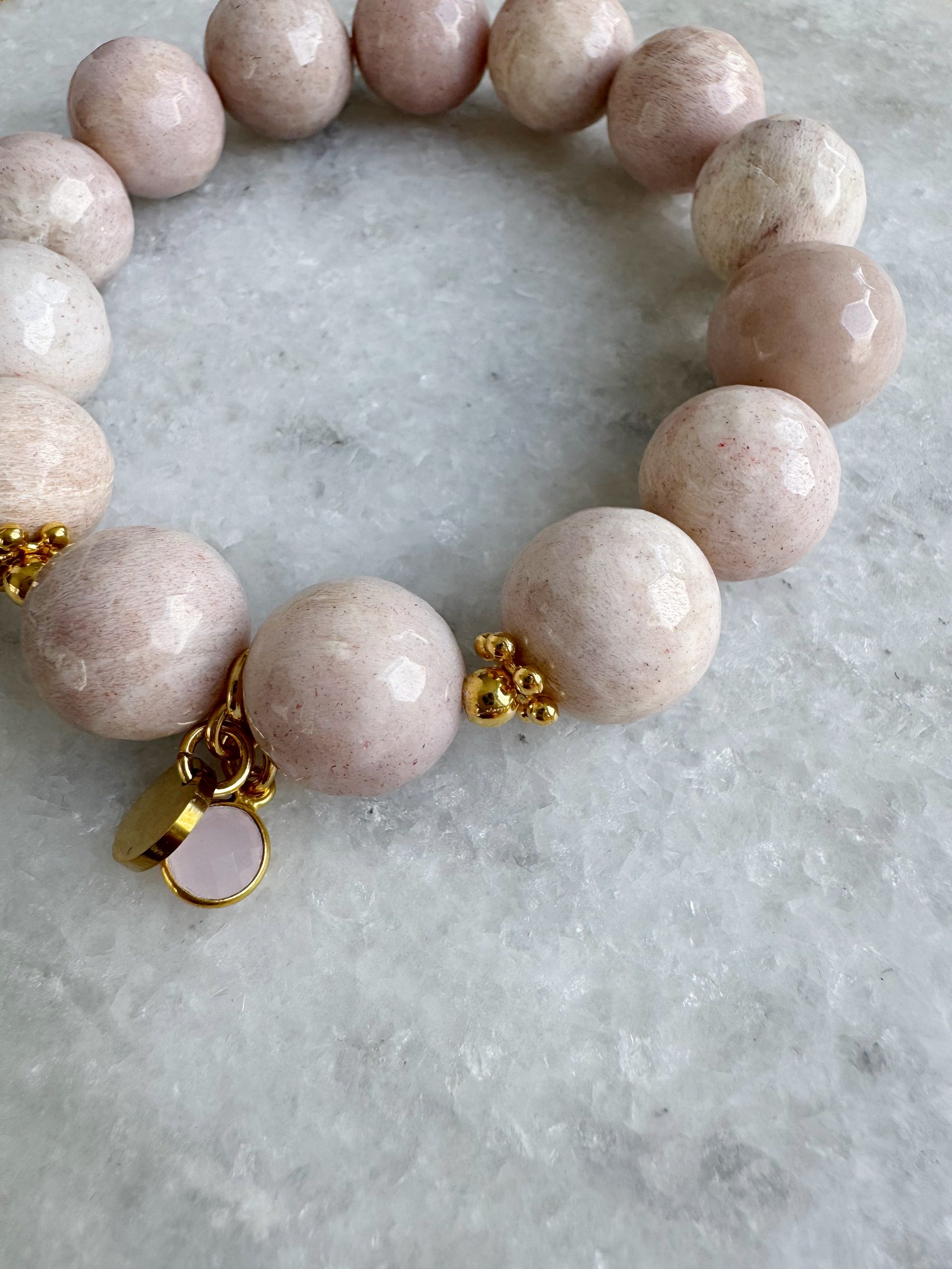 Die extra großen, pastellfarbenen Mondstein-Perlen schimmern in Tönen von Weiß über Creme bis hin zu zartem Rosé. Die einzigartige Färbung und der besondere Facette-Schliff verleiht ihnen eine besonders wertvolle Optik. Der Look wird unterstützt durch einen dezenten Anhänger aus Rosenquarz mit einer Fassung aus vergoldetem 925er Silber.