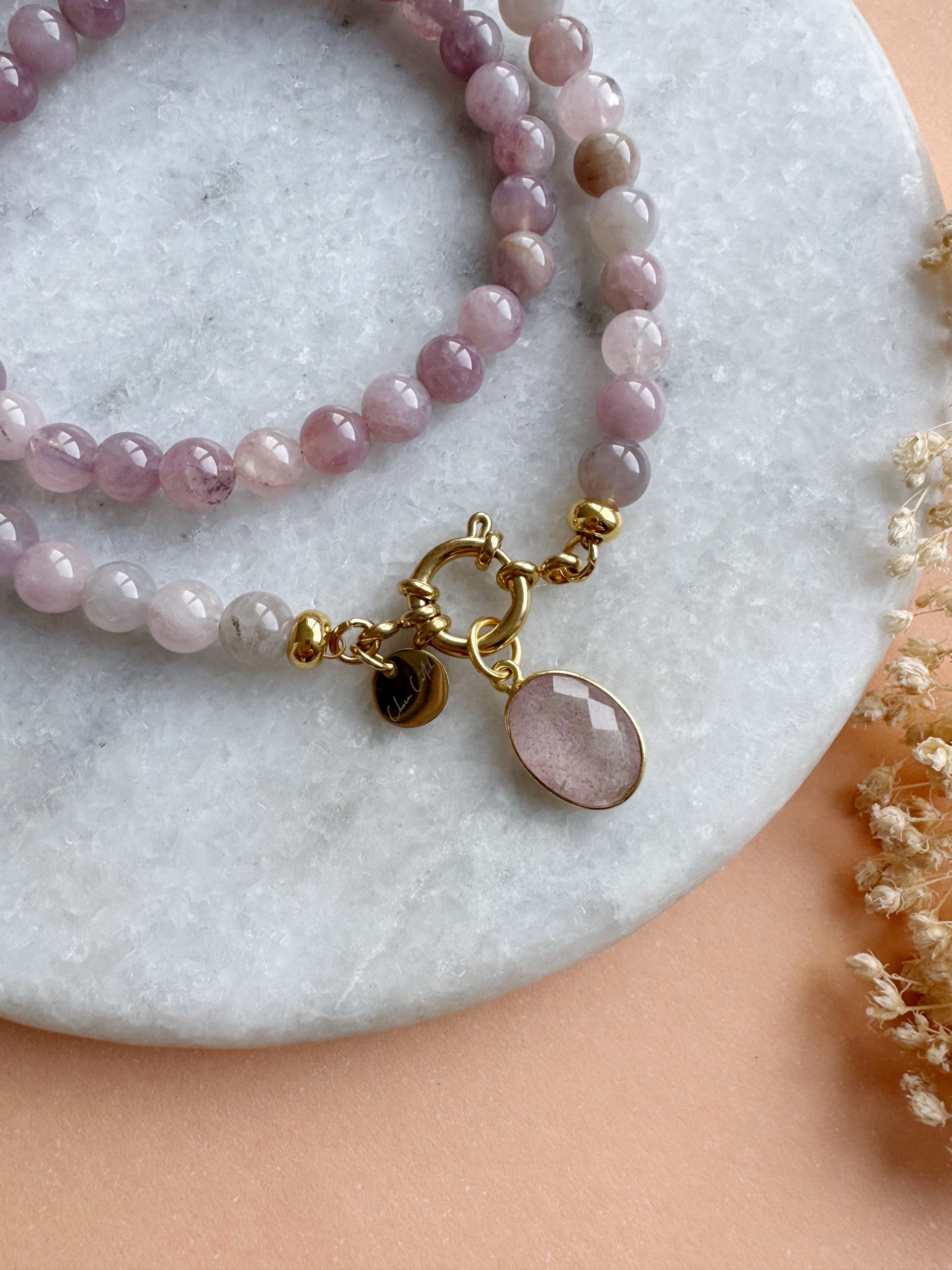 Dieses Kette bringt schönsten Rosenquarz an Deinen Hals. Die zarten pastellenen Perlen im Facettiert-Schliff mit einem passenden goldigen Anhänger aus Quarz bezaubert mit einem Look aus all over Rose.