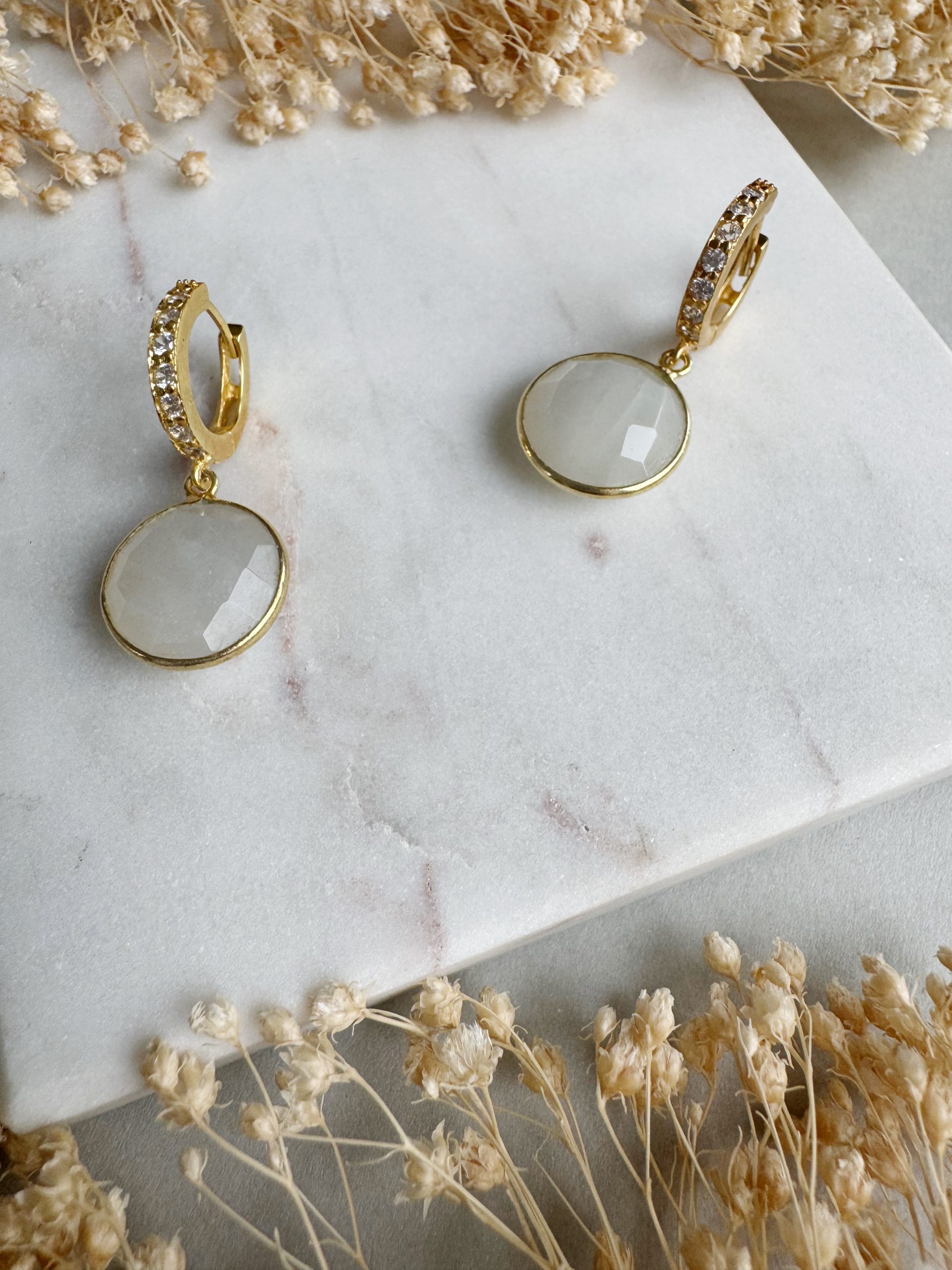 Creole aus 925er Silber, vergoldet mit Zirkonia-Besatz. Den Abschluss bilden Anhänger aus Mondstein.