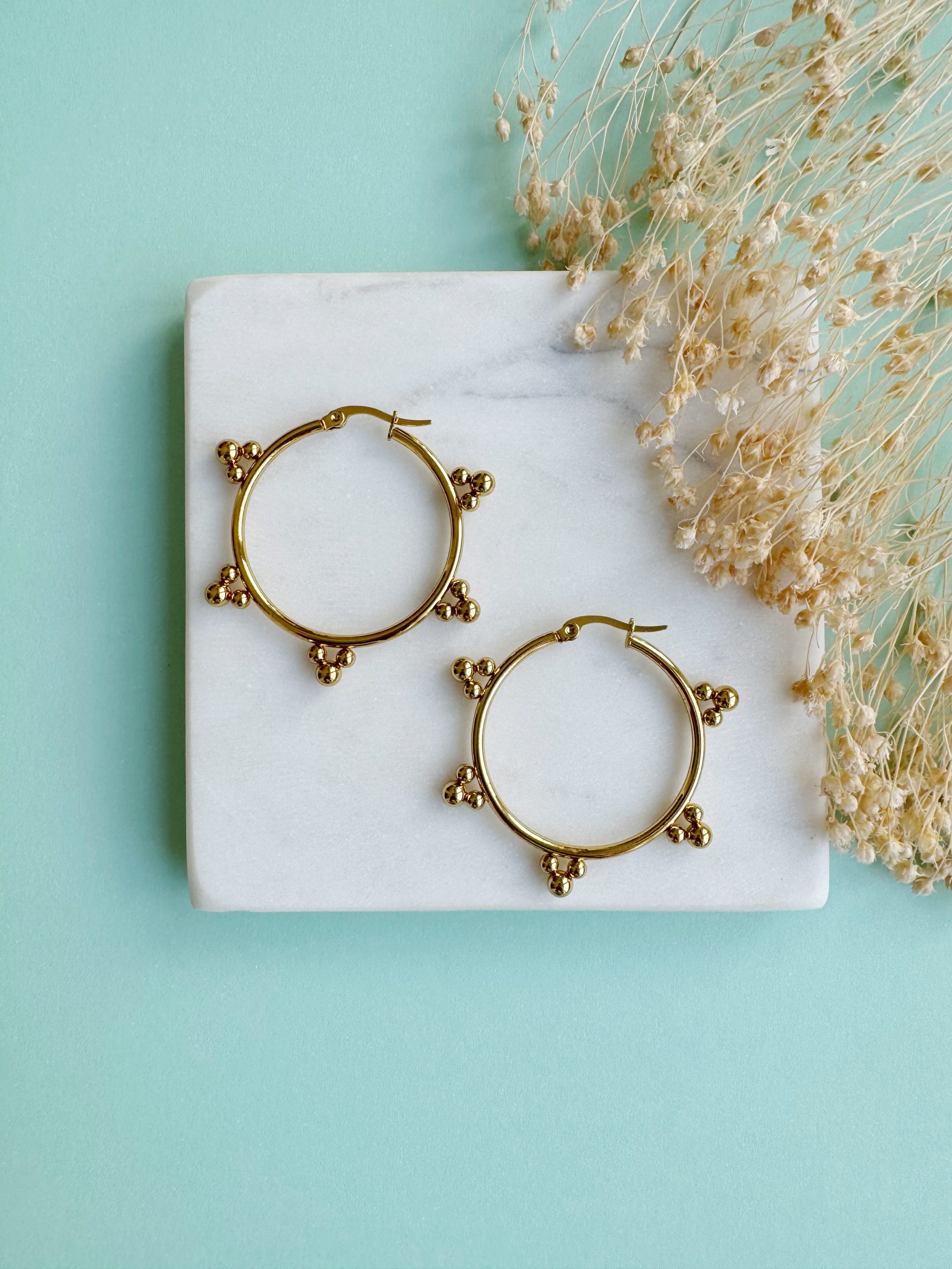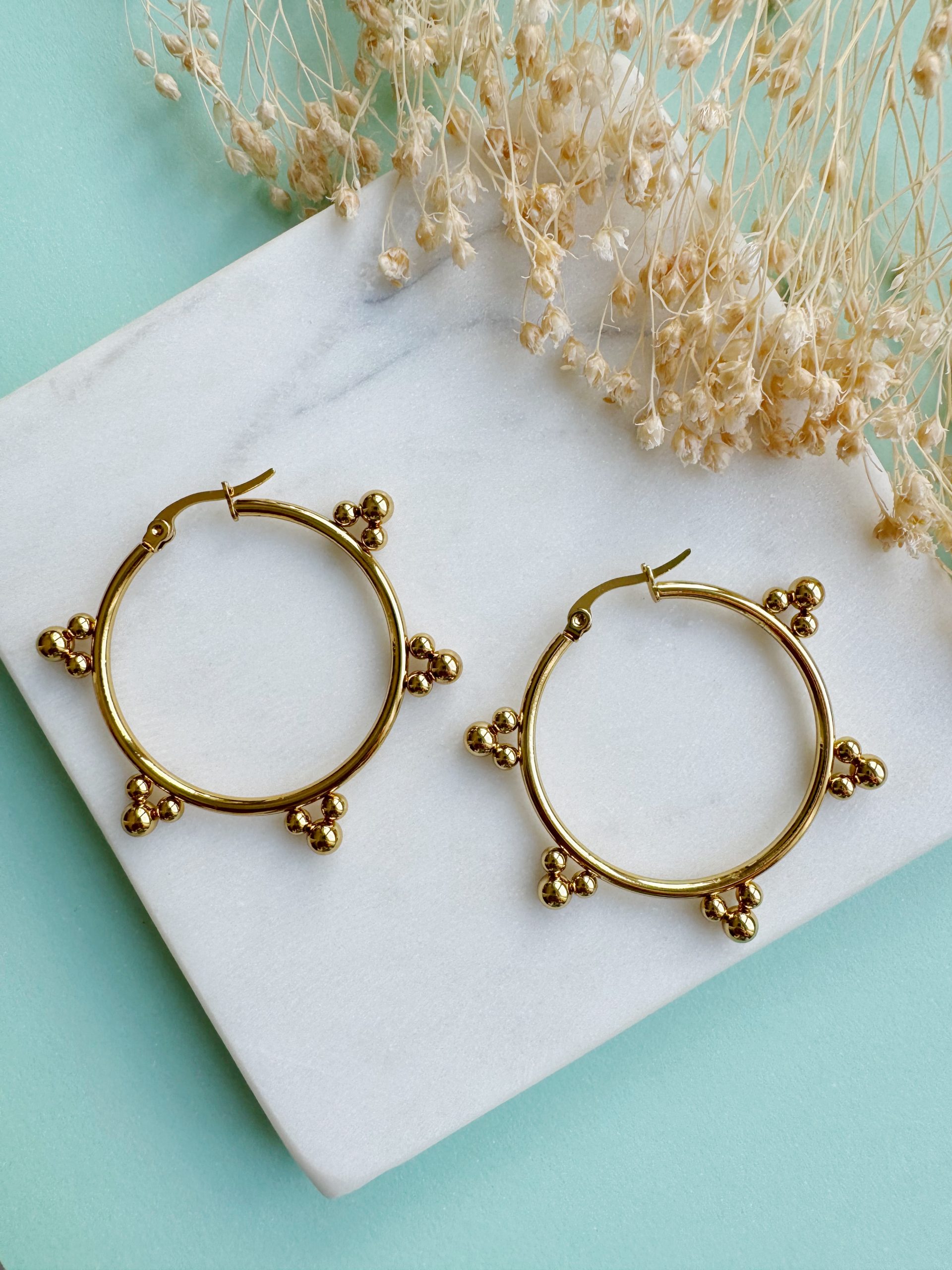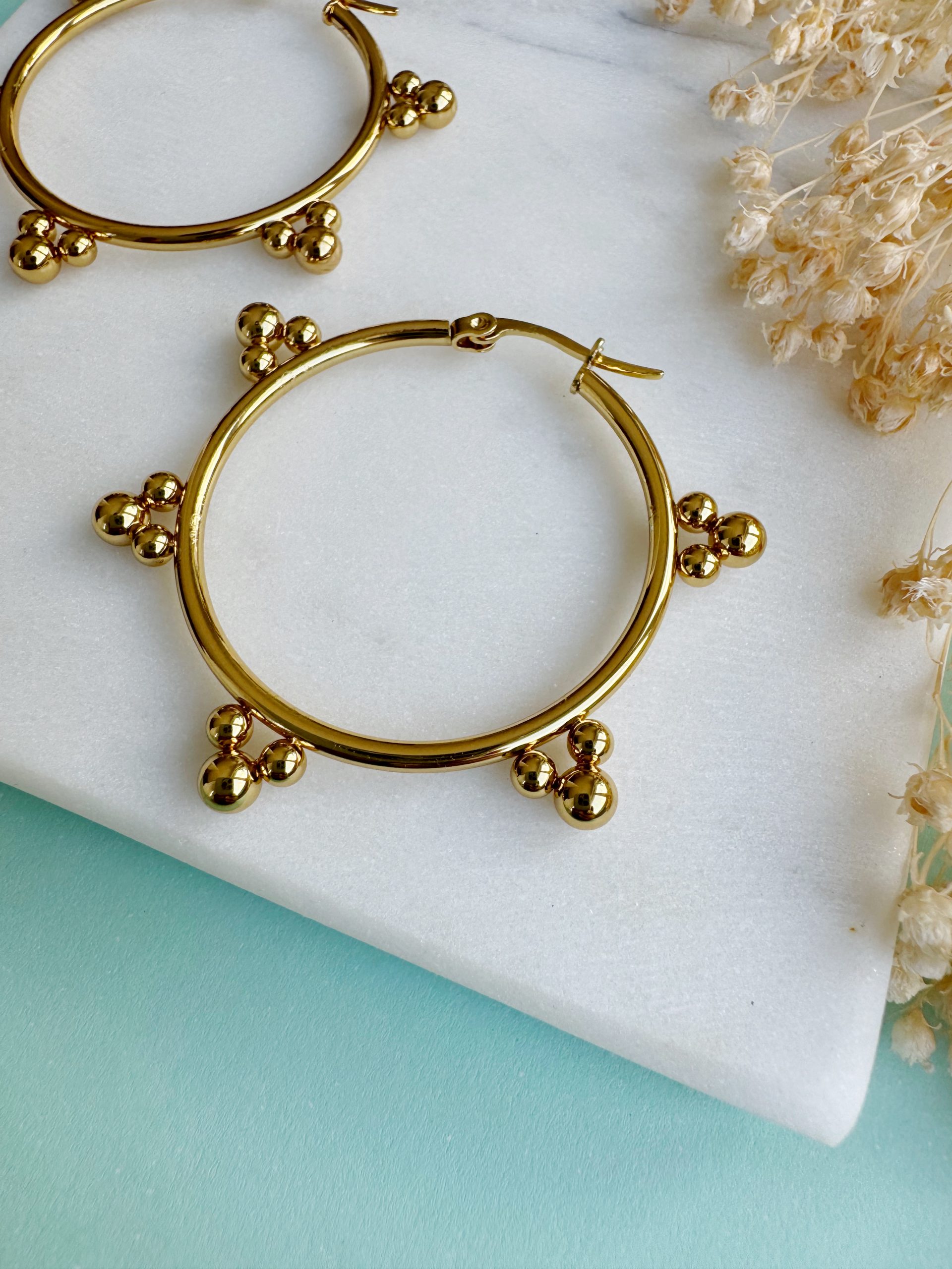 Ein echter Hingucker sind diese großen Creolen, dank ihres Besatzes aus kleinen Goldperlen ringsum. Der rostfreie Edelstahl ist vergoldet und besonders Allergiker-freundlich.