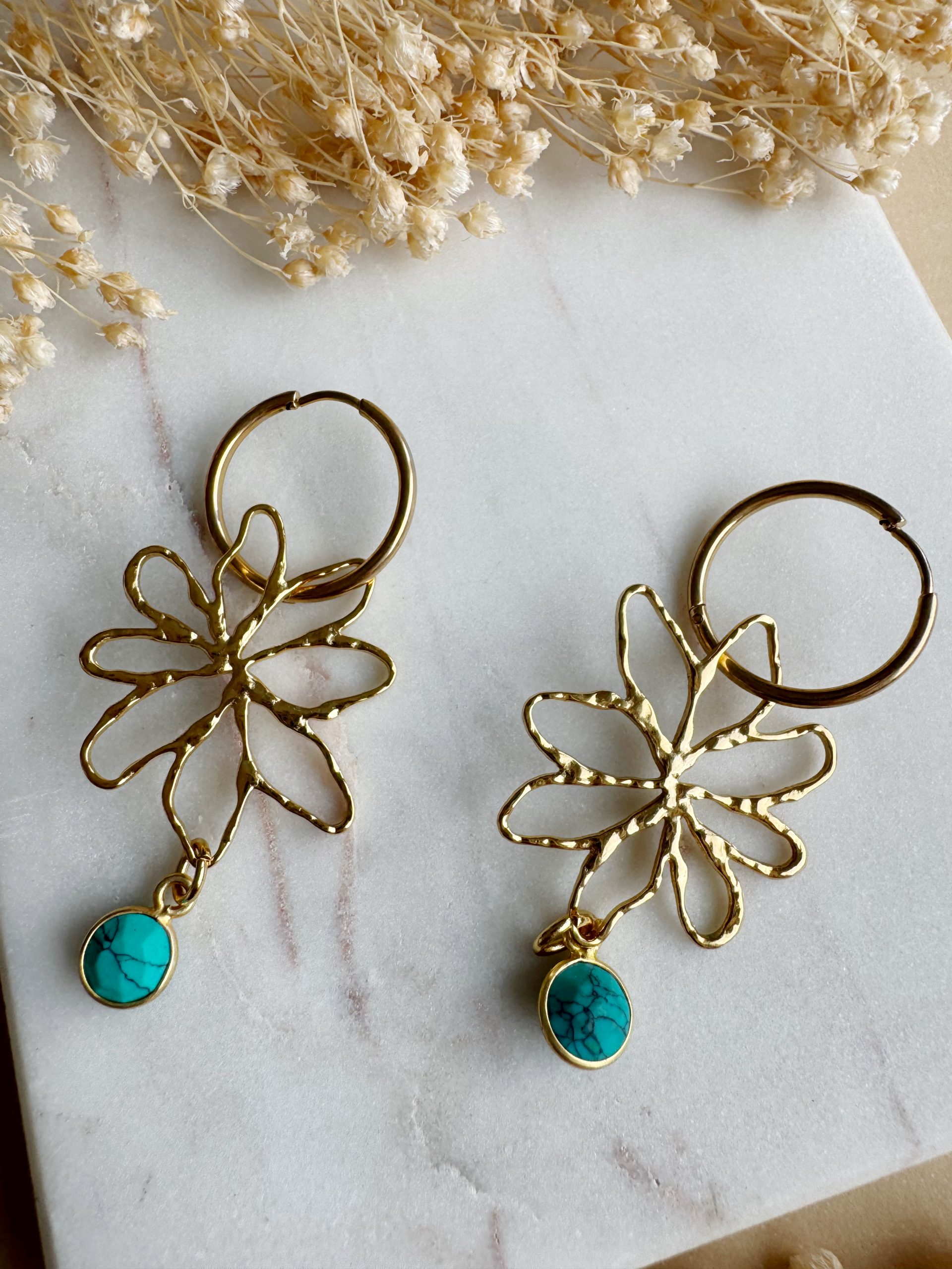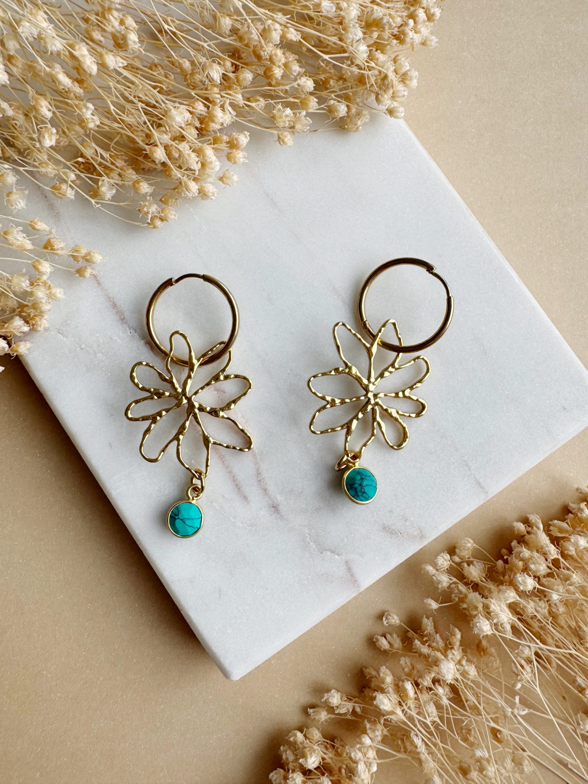 Türkis trifft auf edles Gold: „Celeste“ kombiniert Anhänger in Blumen-Form, goldige Creolen und Anhänger aus Türkis.