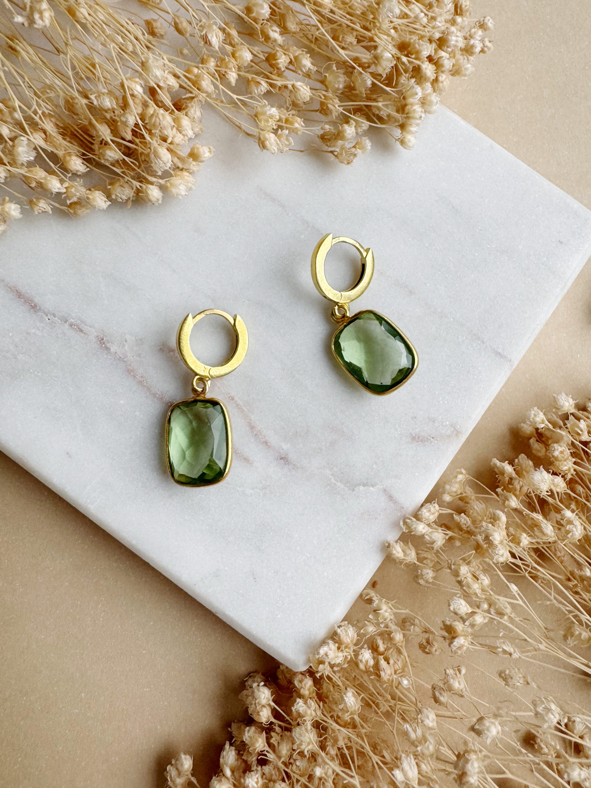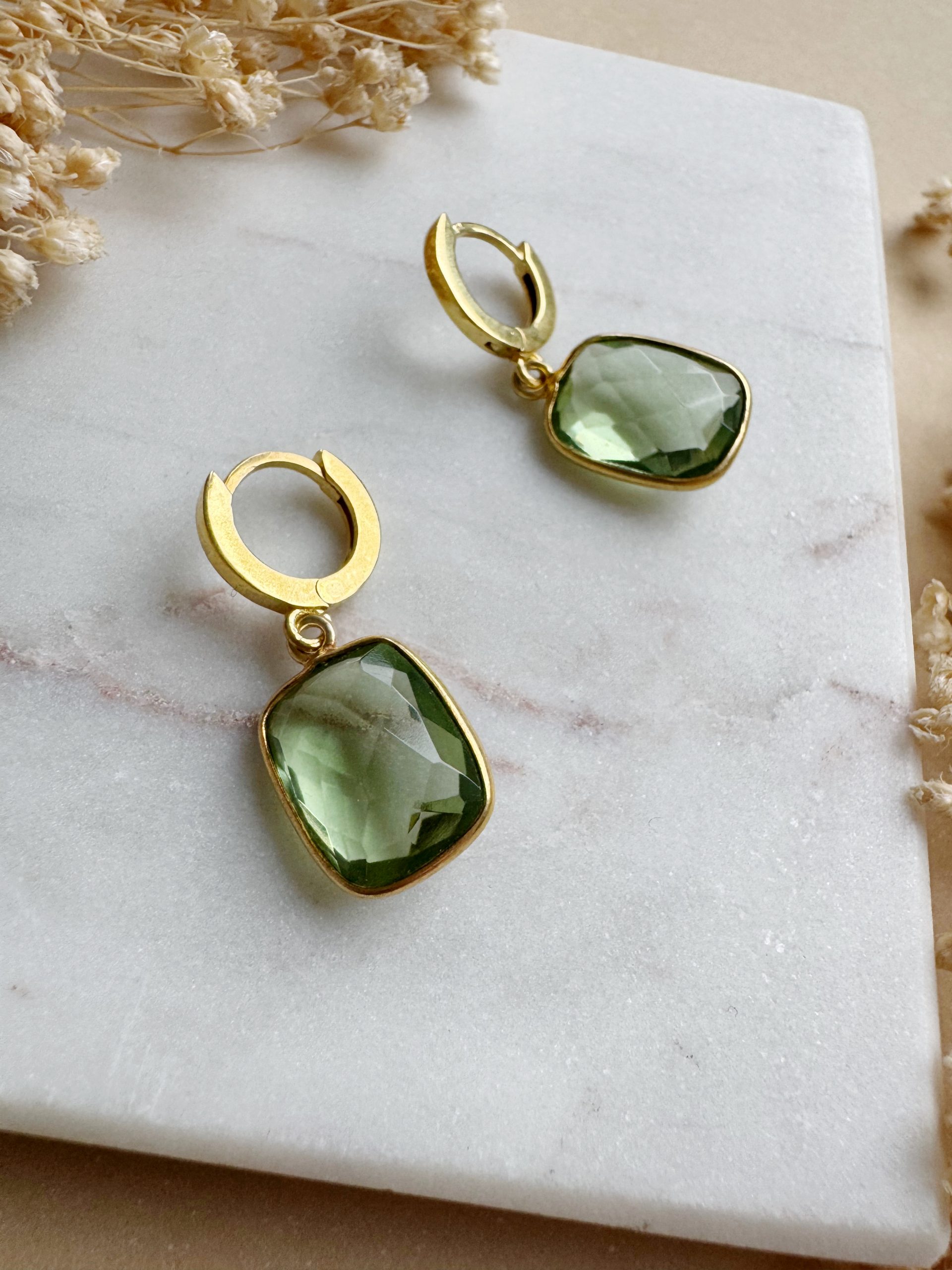 Der Anhänger aus grünem Amethyst macht diese schlichten Ohrringe zu einem unabdingbaren Schmuckstück.  Die vergoldeten Creolen aus 925er Silber setzt ein Statement in jeder Situation.