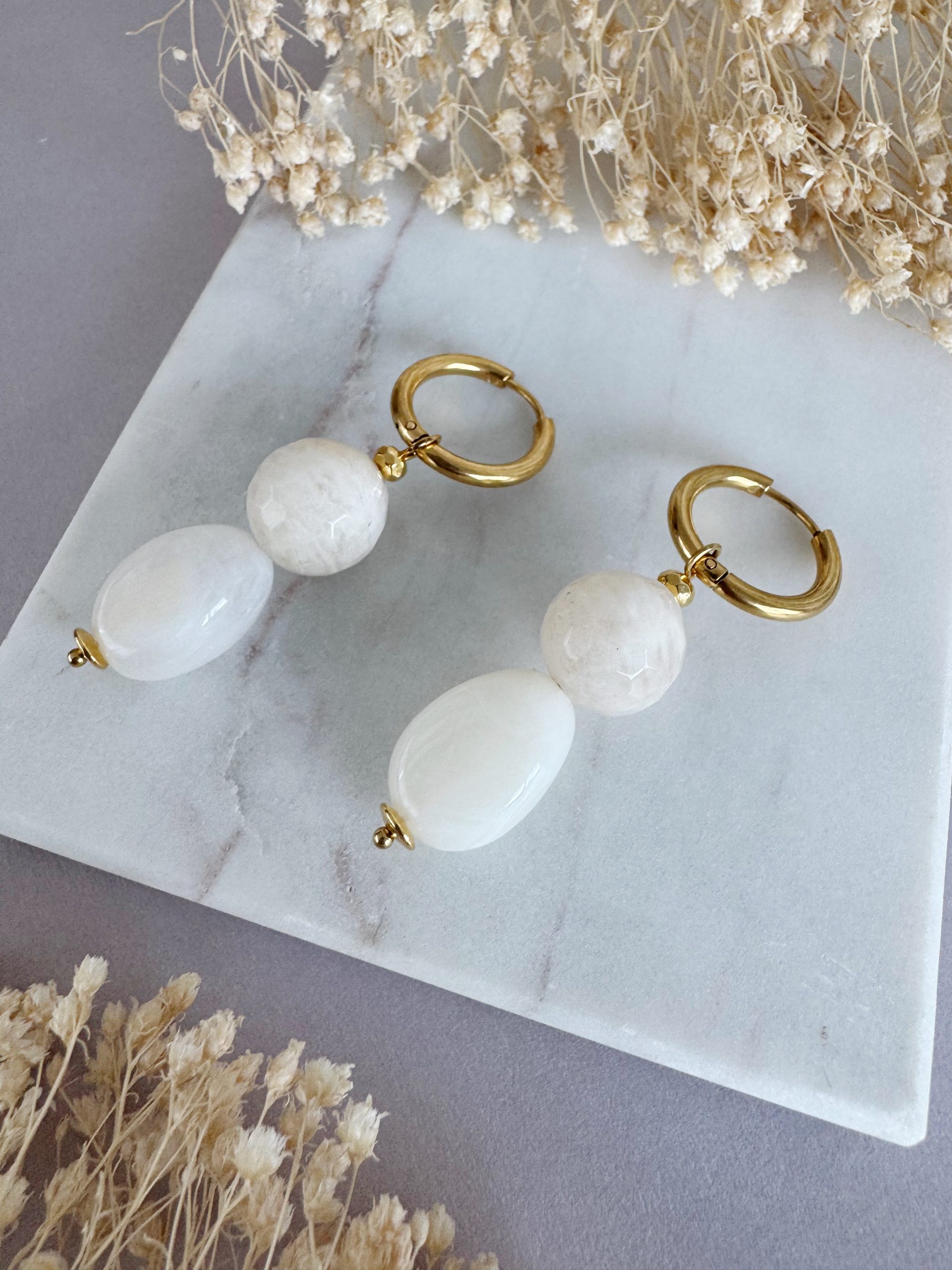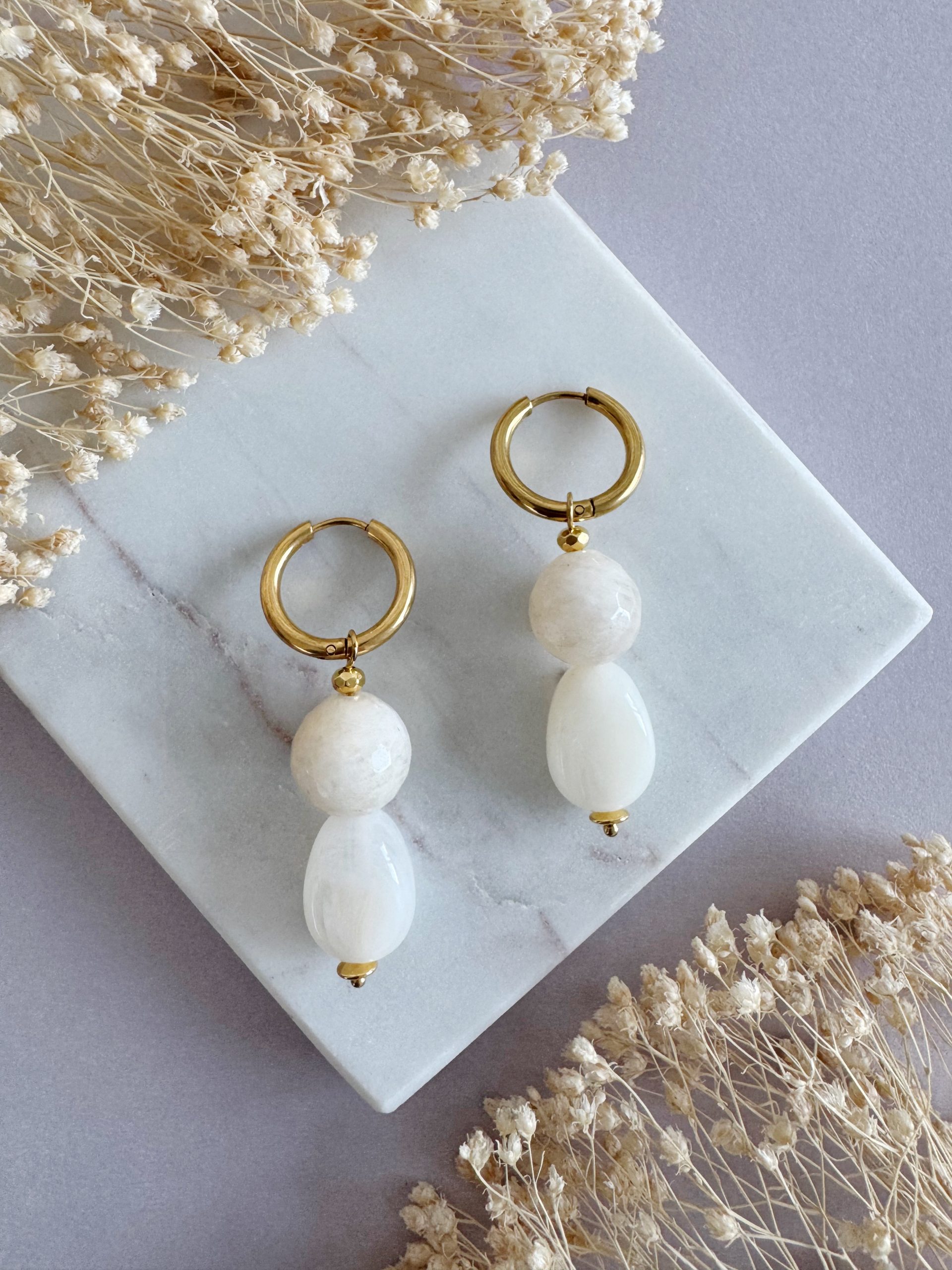 Die Ohrringe in Creolen-Form vollendet mit Creme-farbigen Resin- & Labradorit-Perlen.