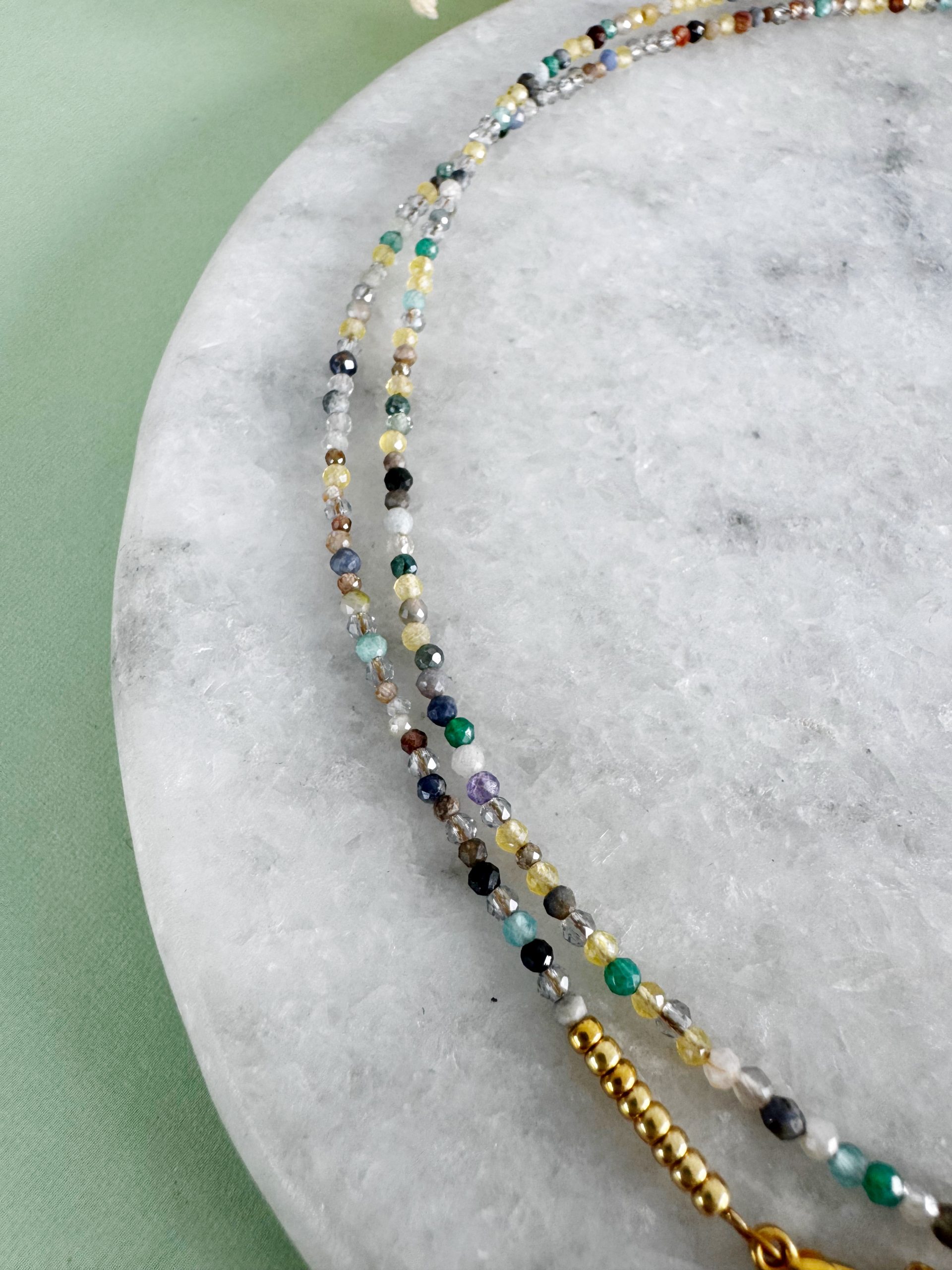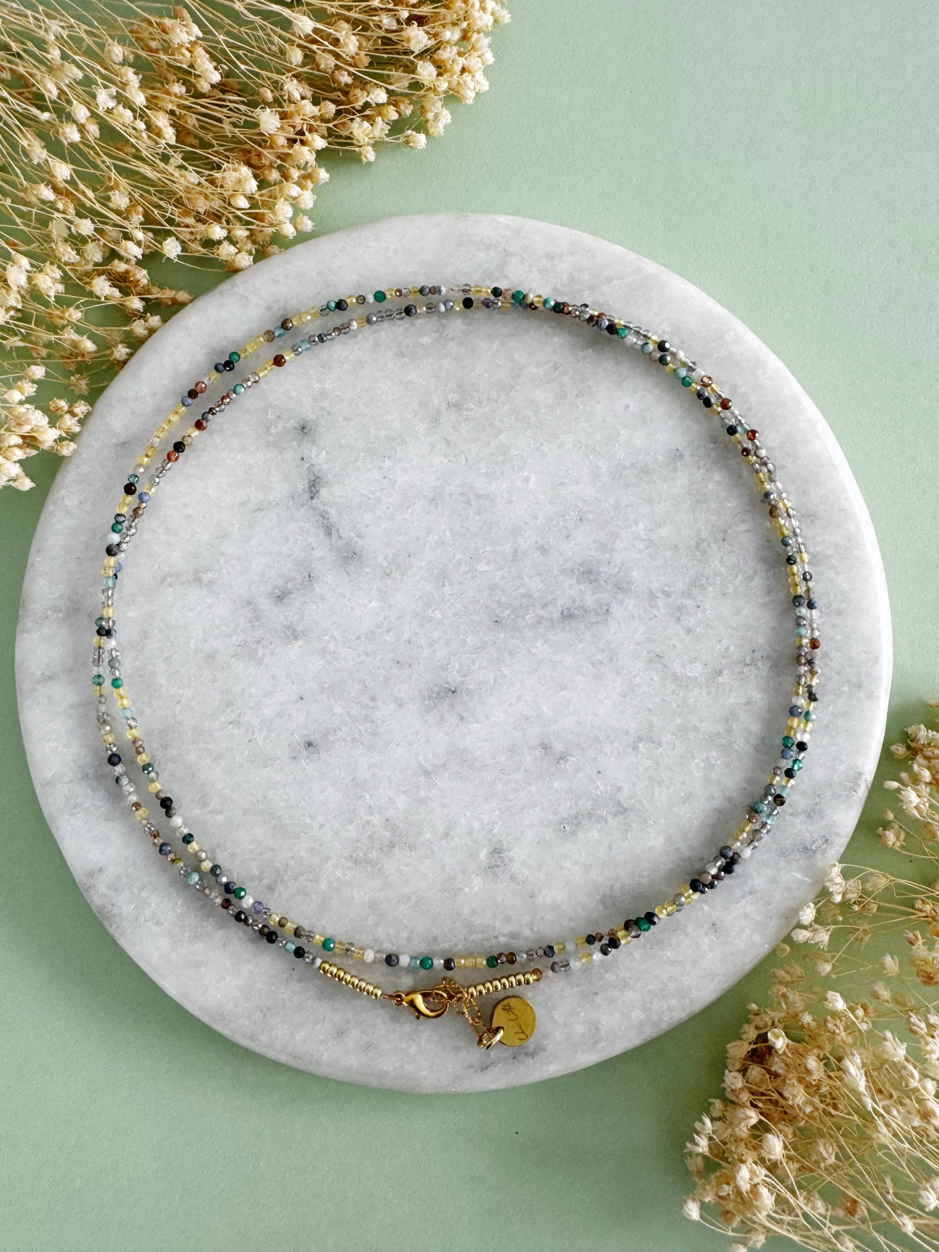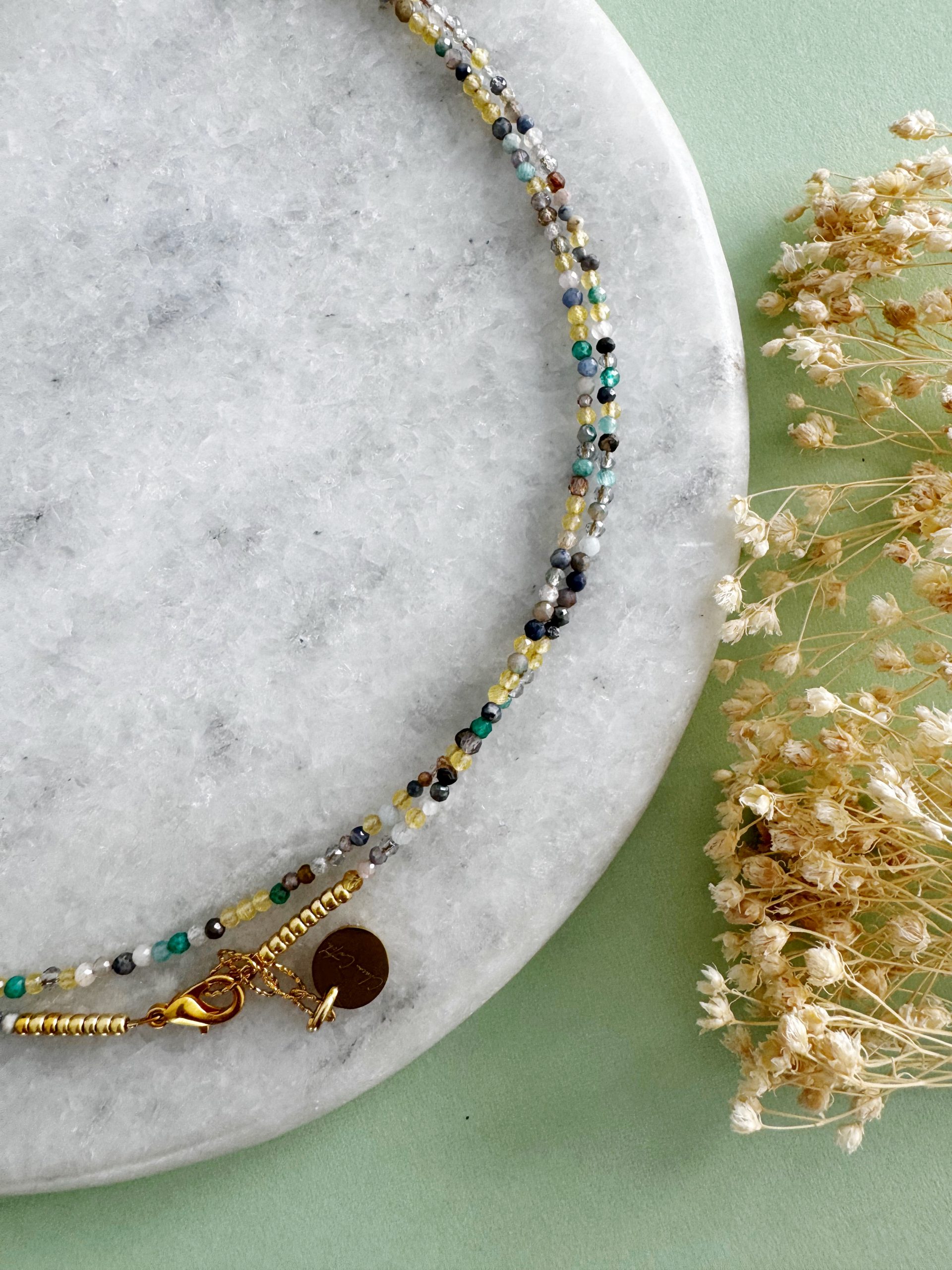 Diese kleine Kette ist wie eine bunte Dusche. Die 3mm kleinen Edelsteinmixperlen schimmern in Türkis,Braun, Beige, Grün, Blau, Gelb und Transparent.