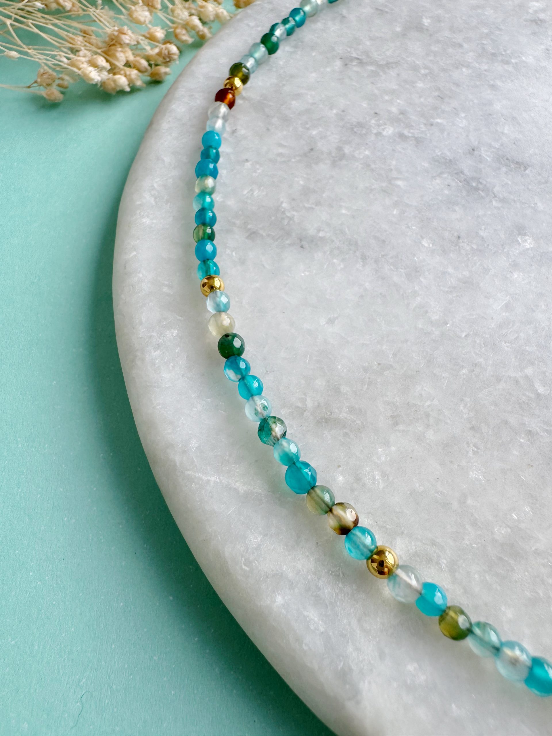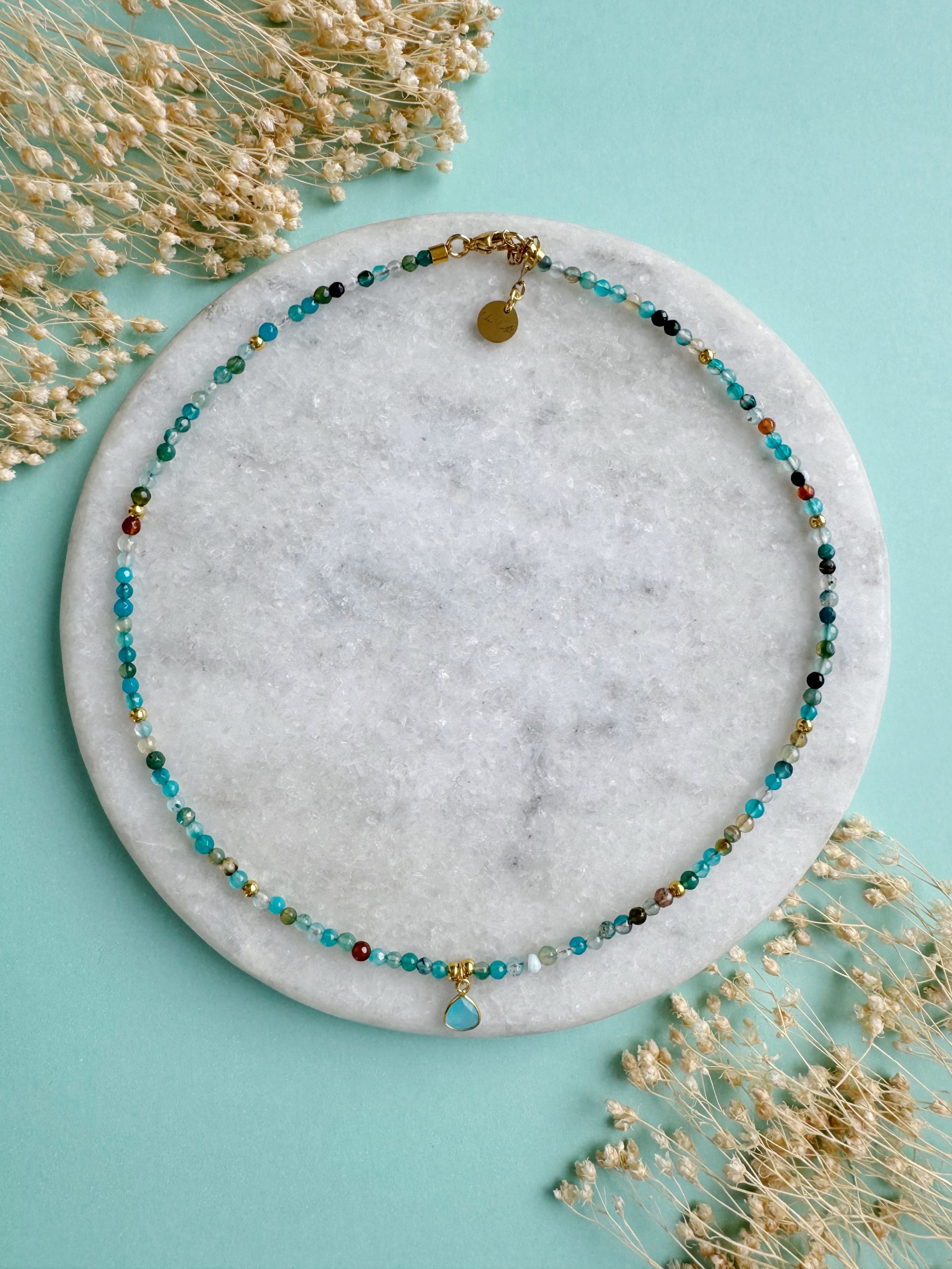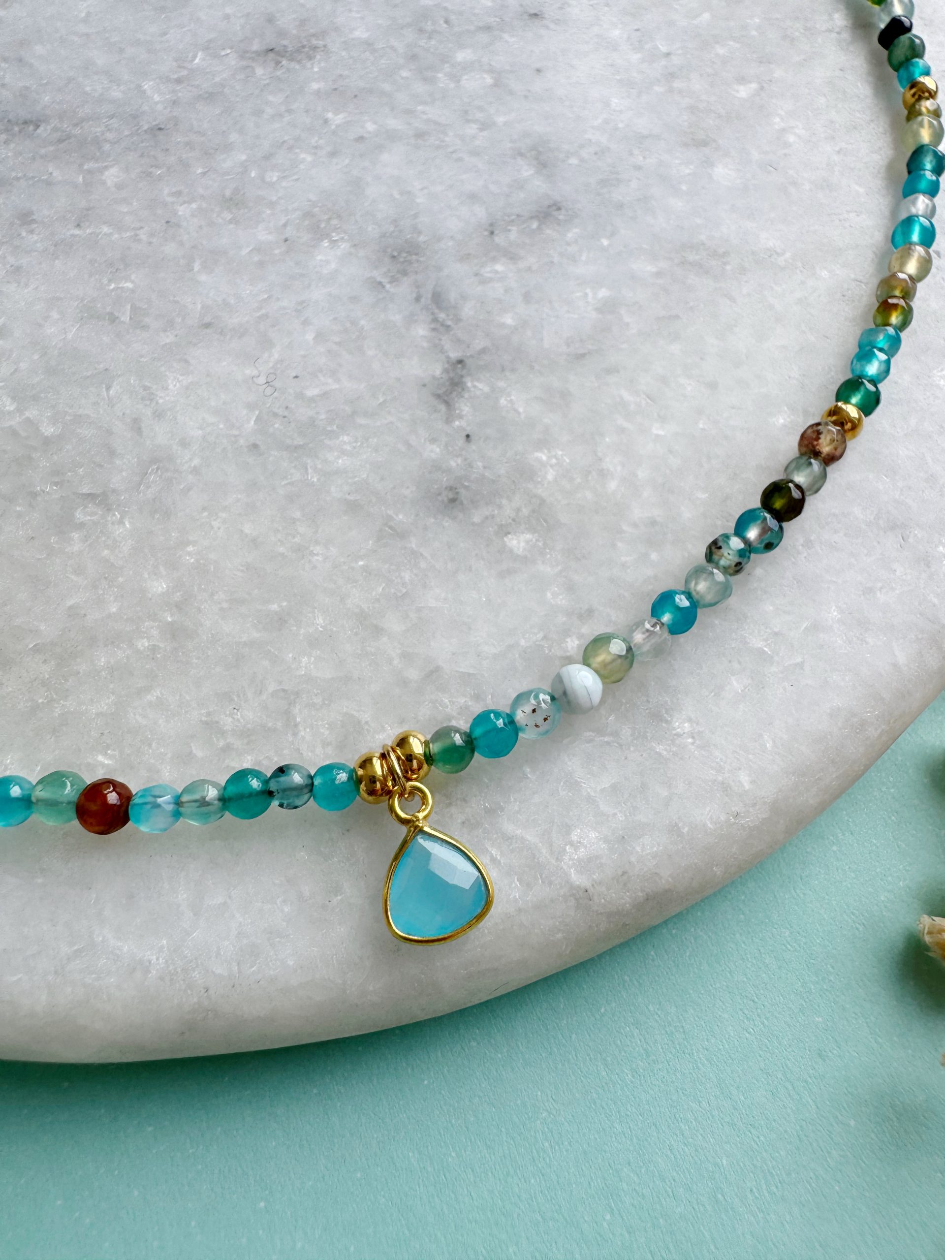 Besonders: Türkis von seiner intensivsten Seite. Die 3mm kleinen Achat-Perlen kommen mit goldigen Details und einem Anhänger aus Chalcedon.