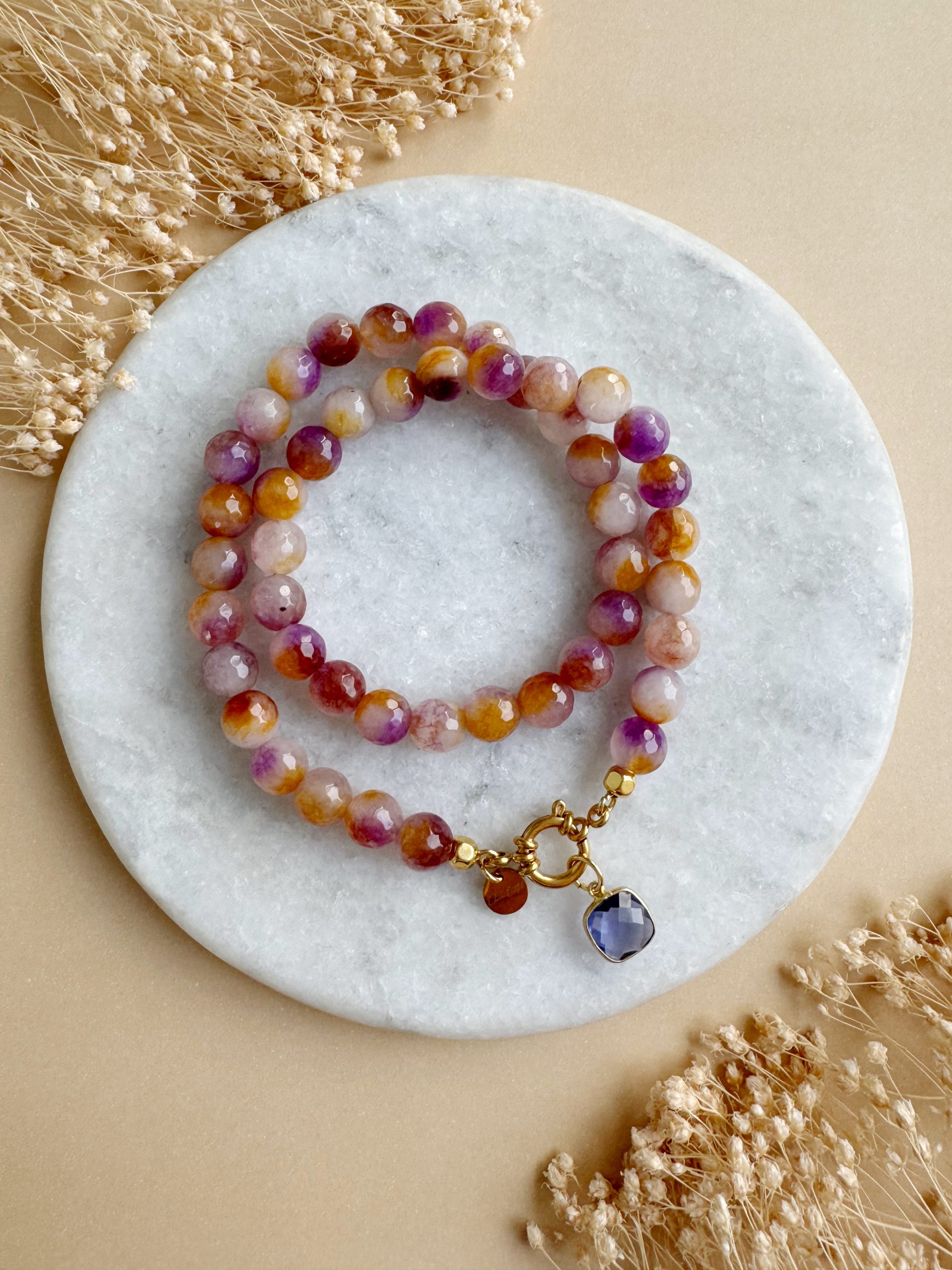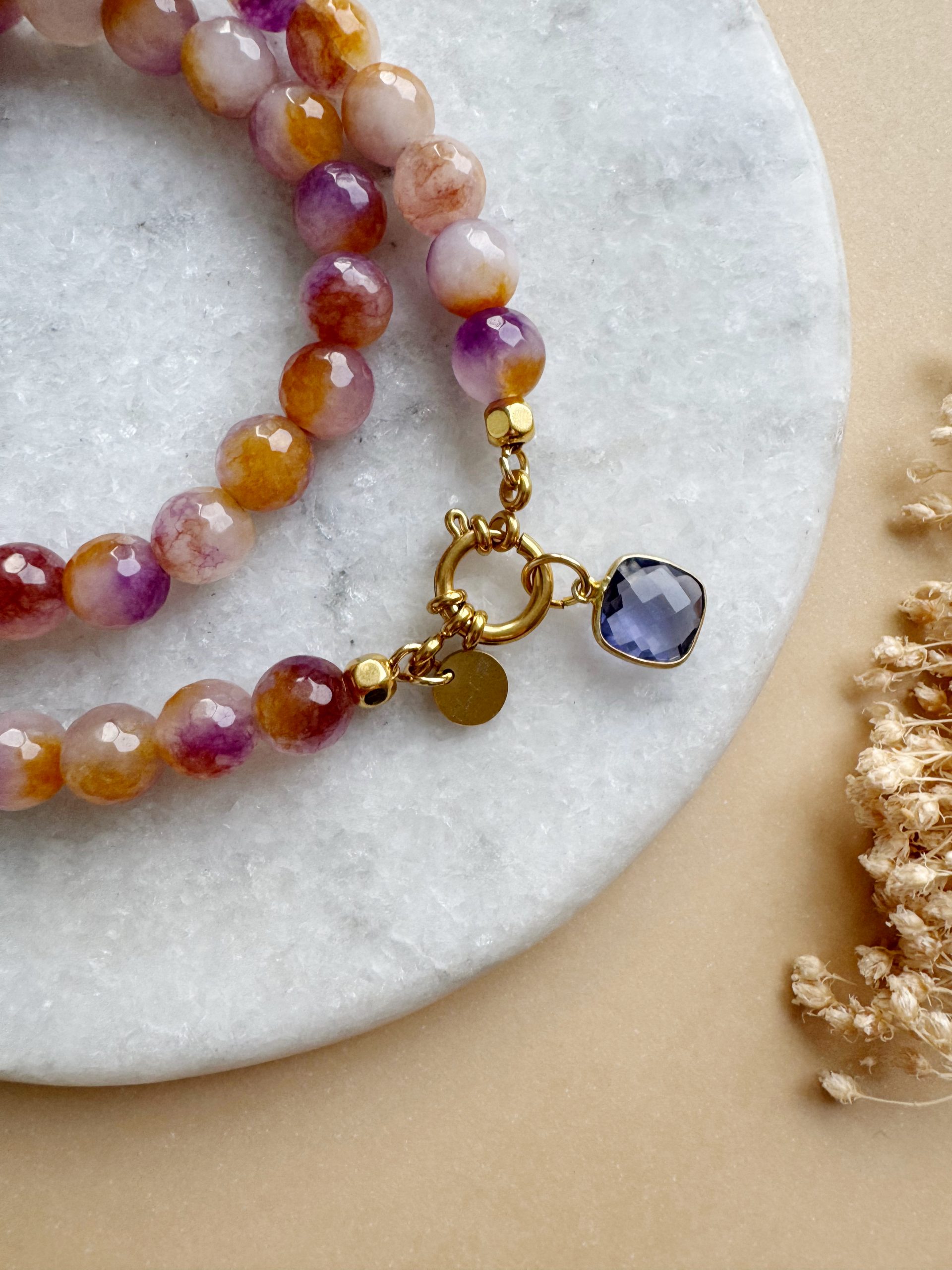 Indian Summer: Orange-Fliederfarbene Achat-Perlen treffen auf goldige Details und einen Anhänger aus Amethyst.