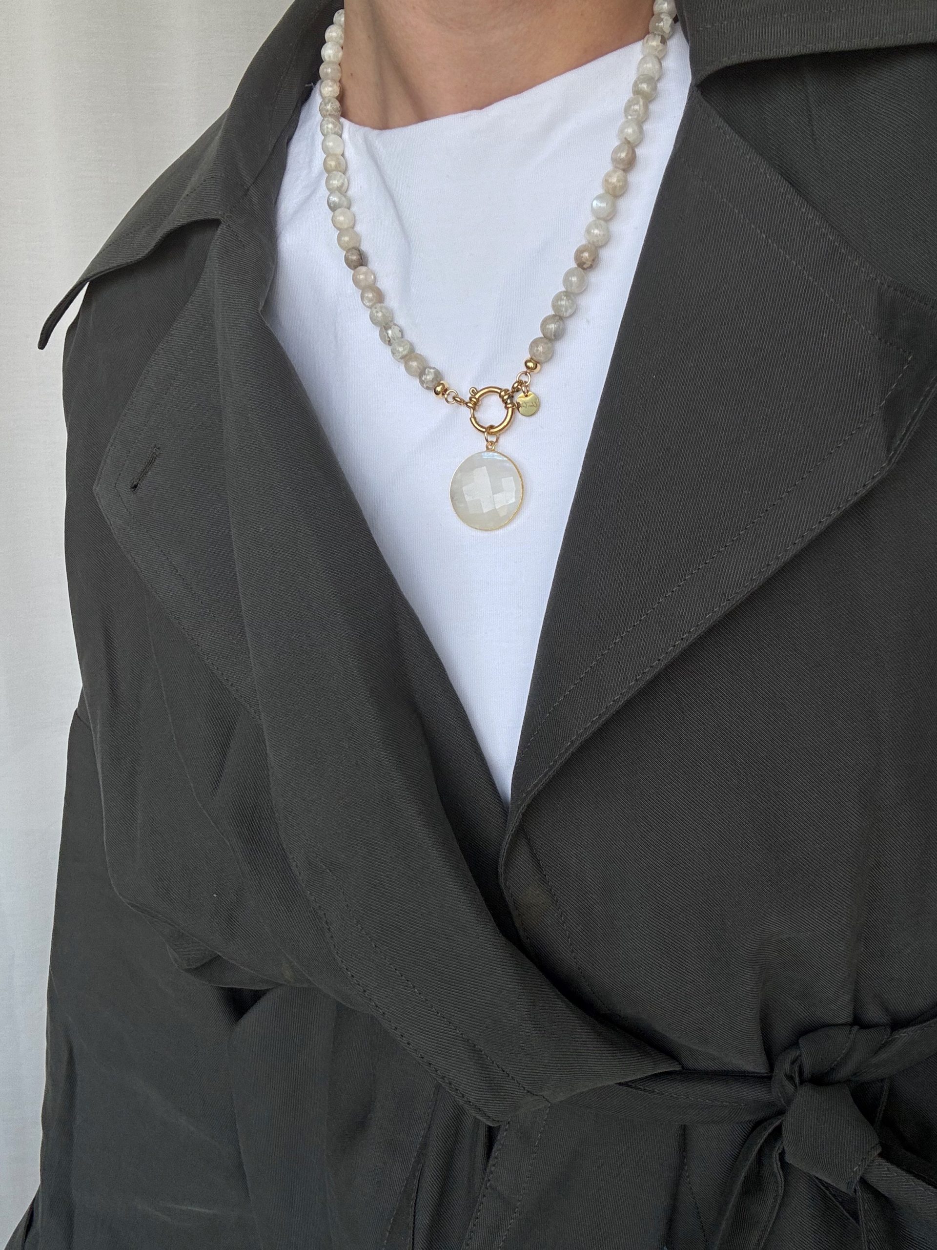 Diese glänzende & gewundene Gliederkette ziert ein besonders auffälliger Anhänger aus weißem Mondstein. Der rostfreie, vergoldete Edelstahl trägt sich federleicht, wobei das Material sich absolut robust zeigt.