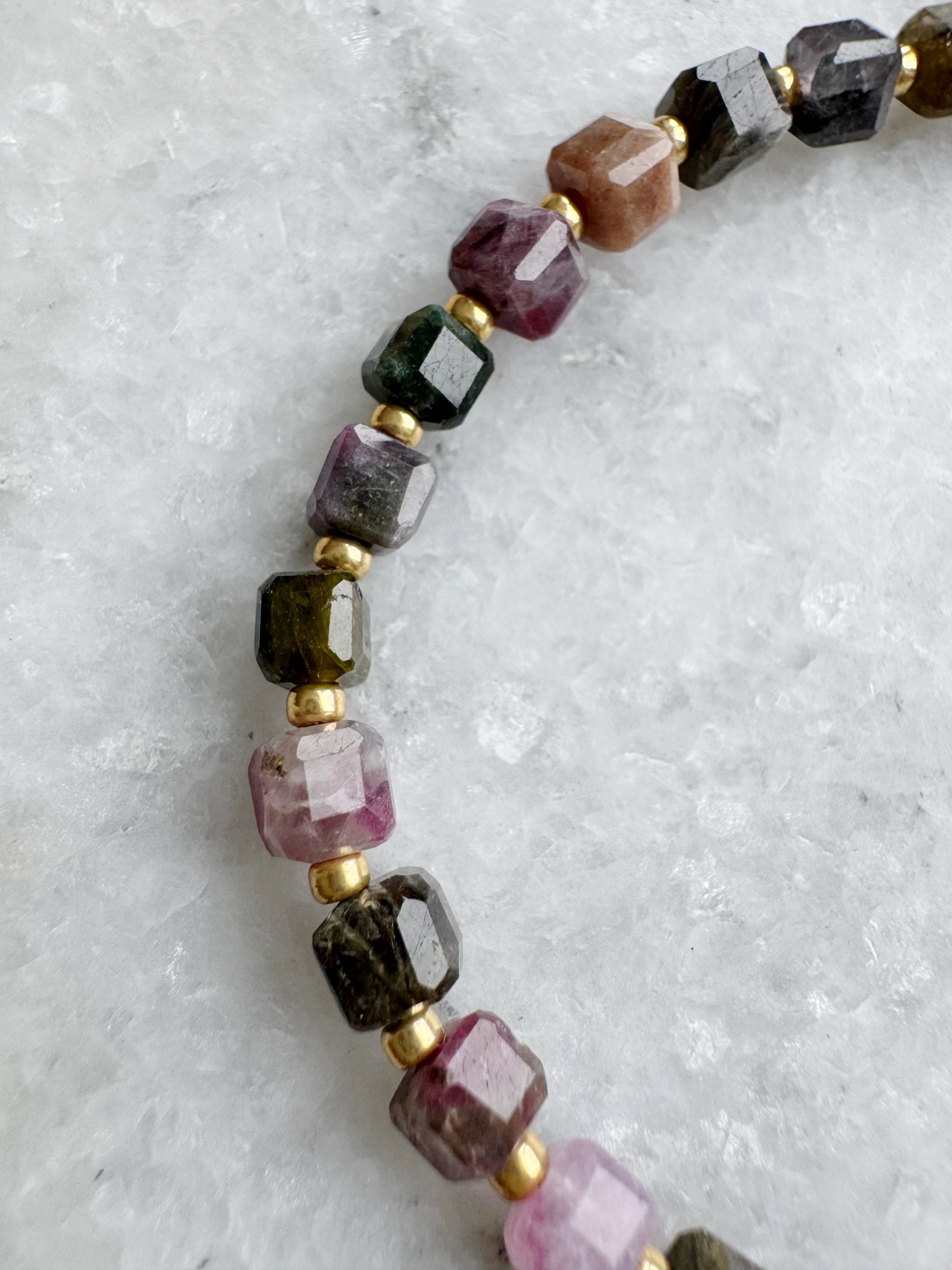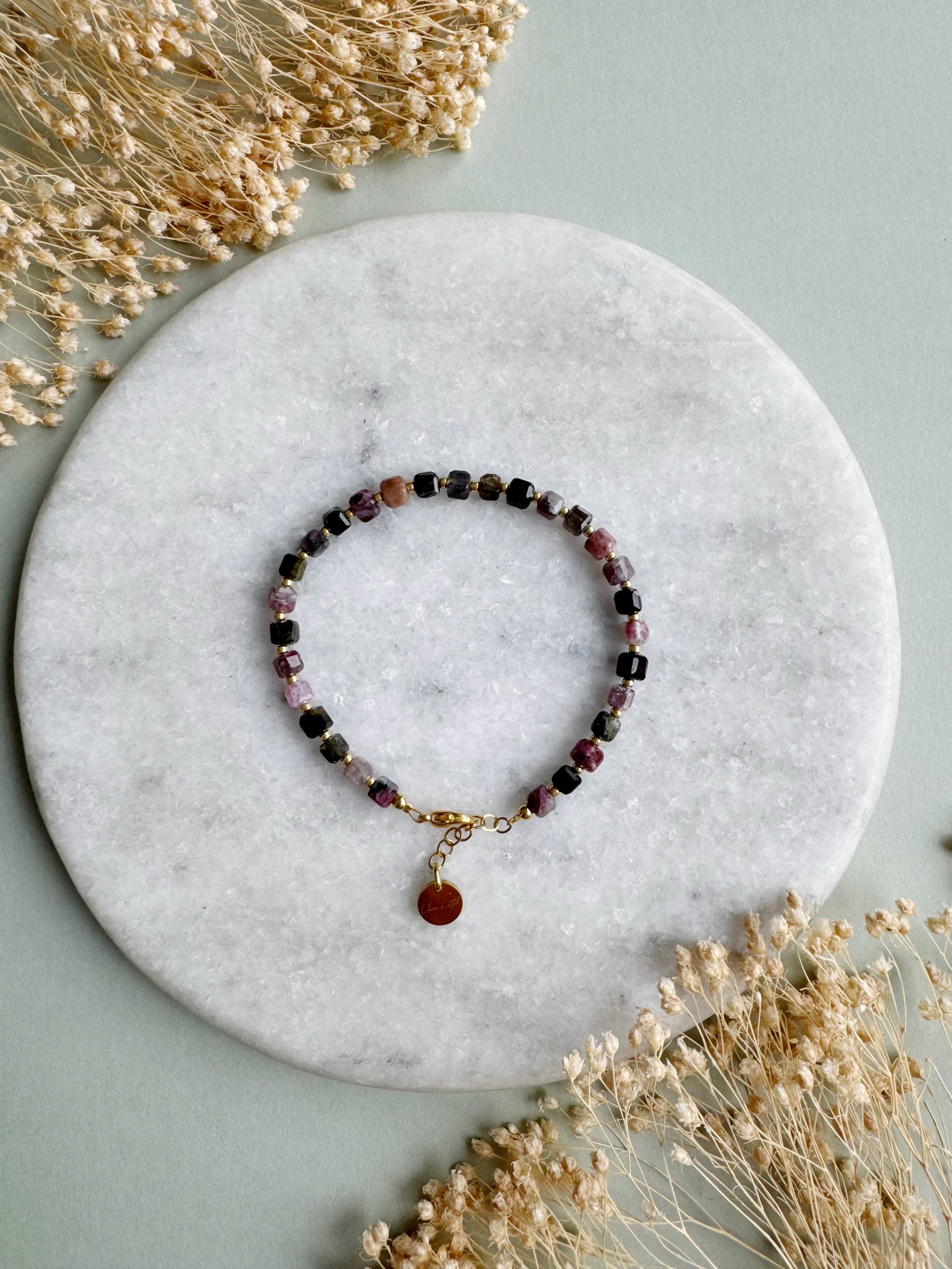 Zartes Armband aus Turmalin-Würfeln in einem Farbmix aus Rosa, Dunkelgrün, Grau und Braun. Das größenverstellbare Armkettchen wird mit einem Federverschluss aus rostfreiem Edelstahl geschlossen.