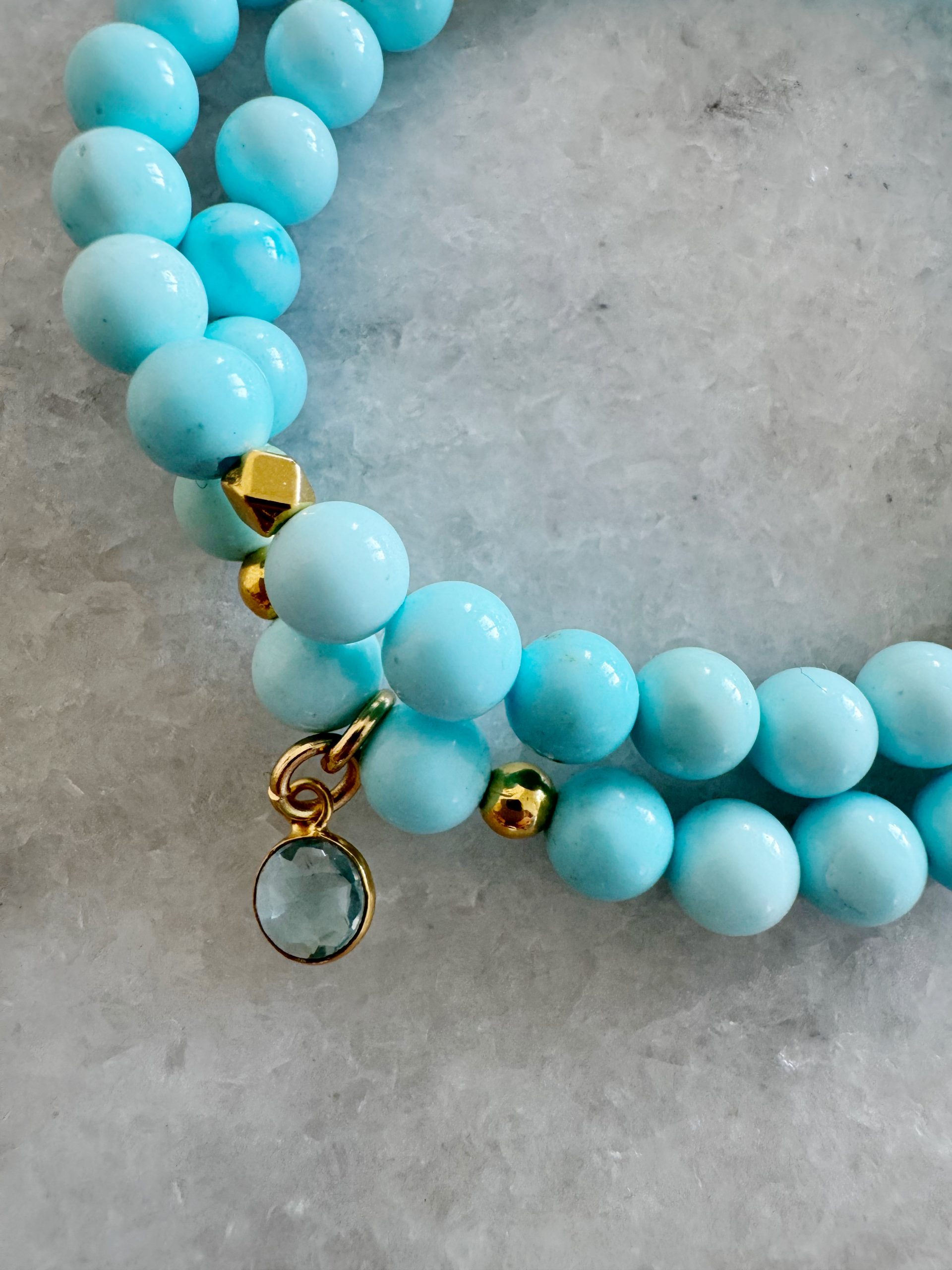 Winter is coming: Eisig hellblaue Jade-Perlen im Zweier-Set. Dazu passen goldene Details, ein Plättchen-Charm und ein Anhänger aus Chalcedon.